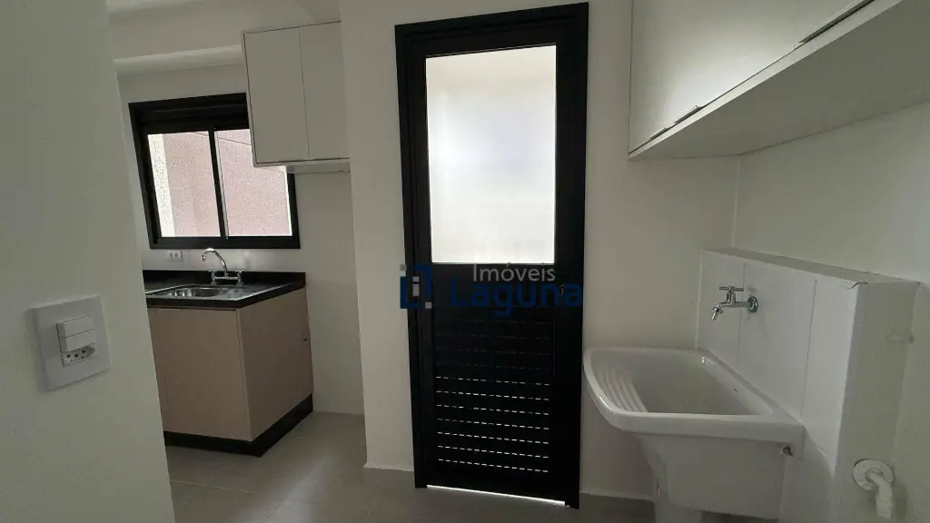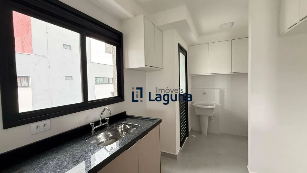 - Cozinha: Planejada com armários sob medida, bancada em granito preto e integração com a área de serviço, também com móveis planejados.
