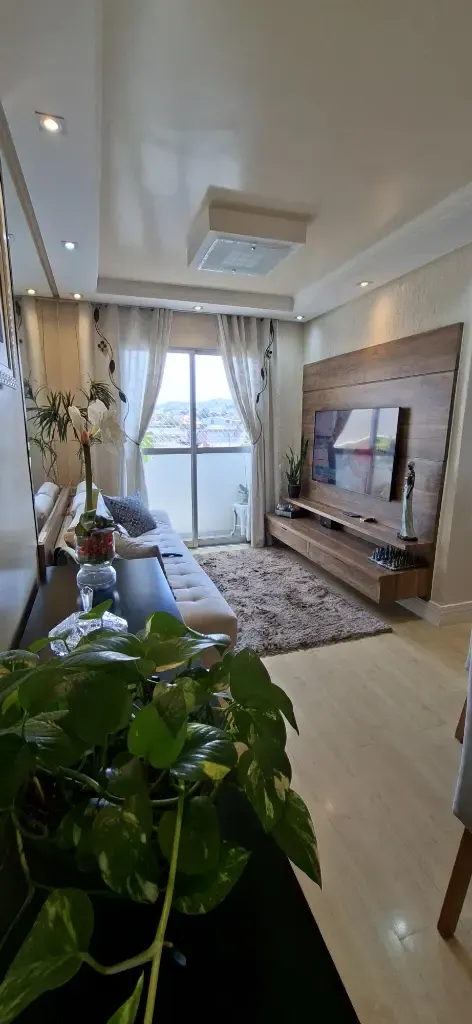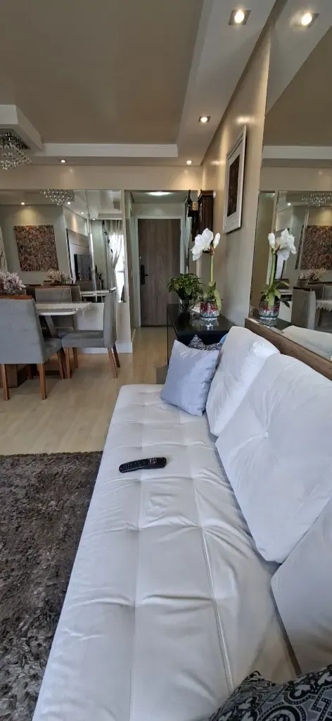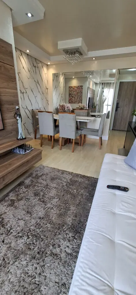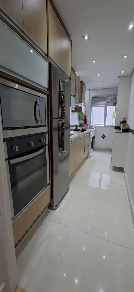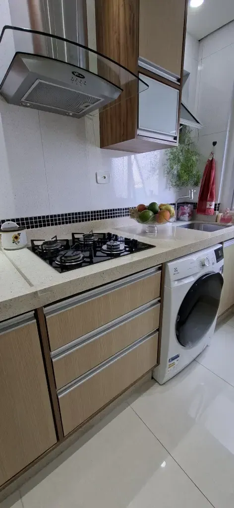 Imóvel com 56m², 3 dormitórios com planejados, sala com sofá e painel para televisão, mesa com cadeiras, cozinha completa planejada com geladeira, fogão Cooktop, forno de embutir, micro-ondas, lavanderia com máquina de lavar roupas, banheiro completo e 1 Vaga de garagem.