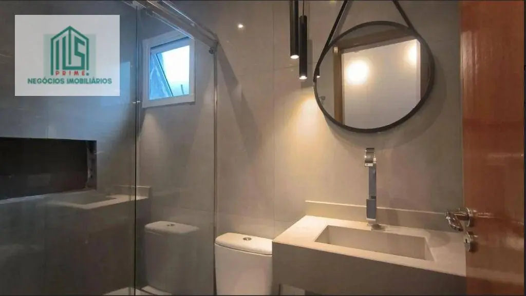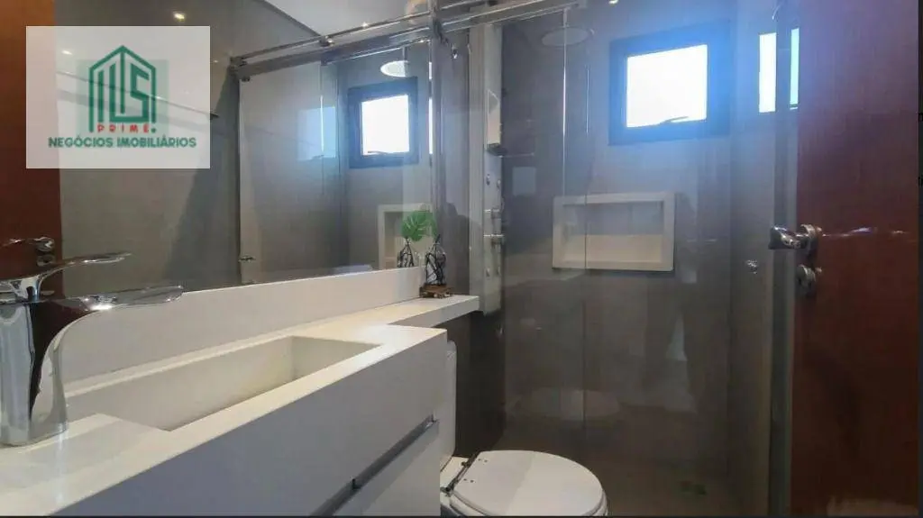Os banheiros são equipados com pias em mármore e box com roldanas aparentes, agregando elegância ao ambiente.