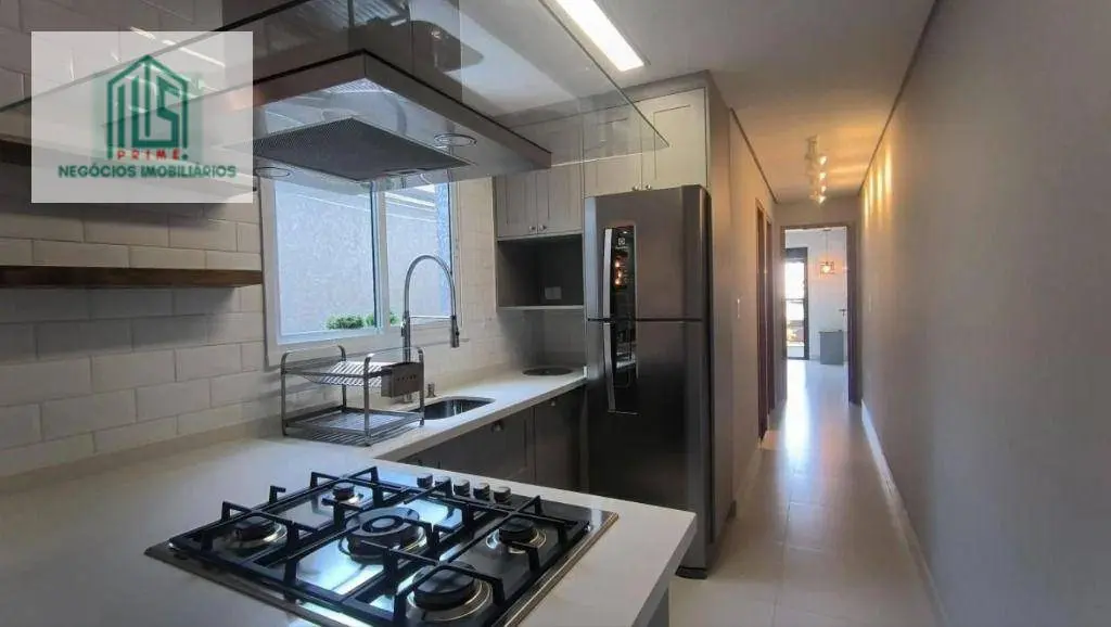 A cozinha possui pia em quartzo branco e torneira gourmet com água quente e fria e filtro.