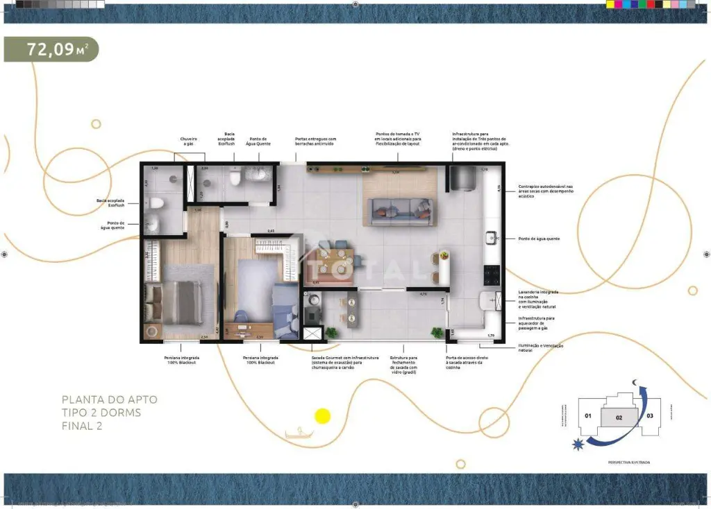 O condomínio conta com Academia | Piscina | Playground | Salão de festas | Pet Place | Espaço Gourmet | Pergolado | Área de convivência | Depósito de entregas | Pet Wash | Espaço oficina | Coworking | Deck seco e molhado