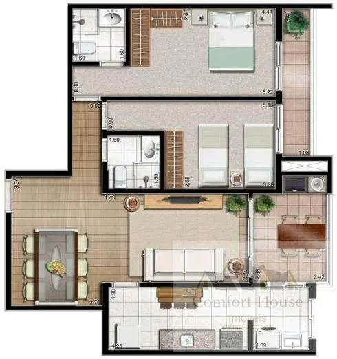 c2 dormitórios c90 m2 1 Suíte, banheiro social, uma sala com sacada gourmet, banheiro social, sacadas, cozinha e área de serviço