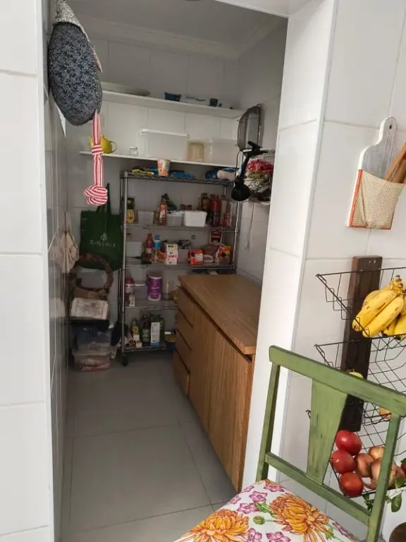 A cozinha é ampla e funcional, equipada com móveis planejados de alta qualidade, piso em porcelanato, bancada em mármore, totalmente azulejada e com despensa separada.
