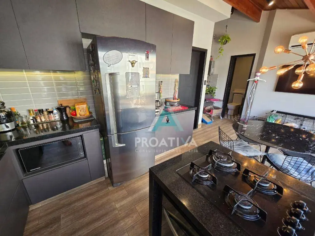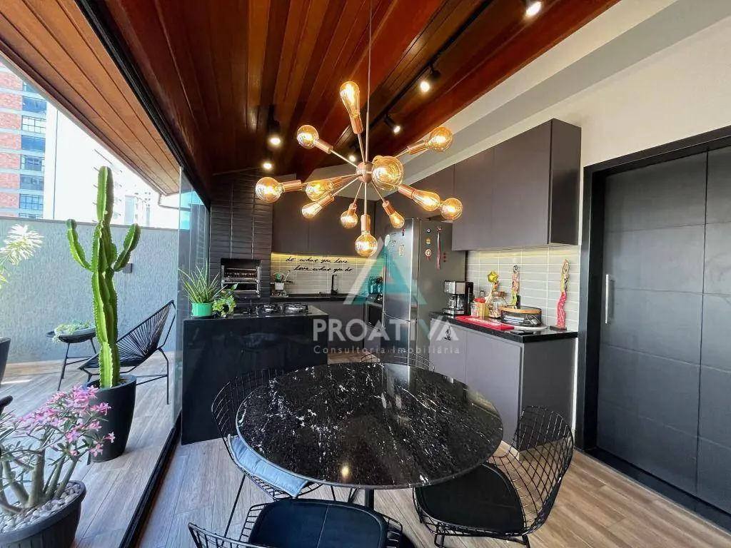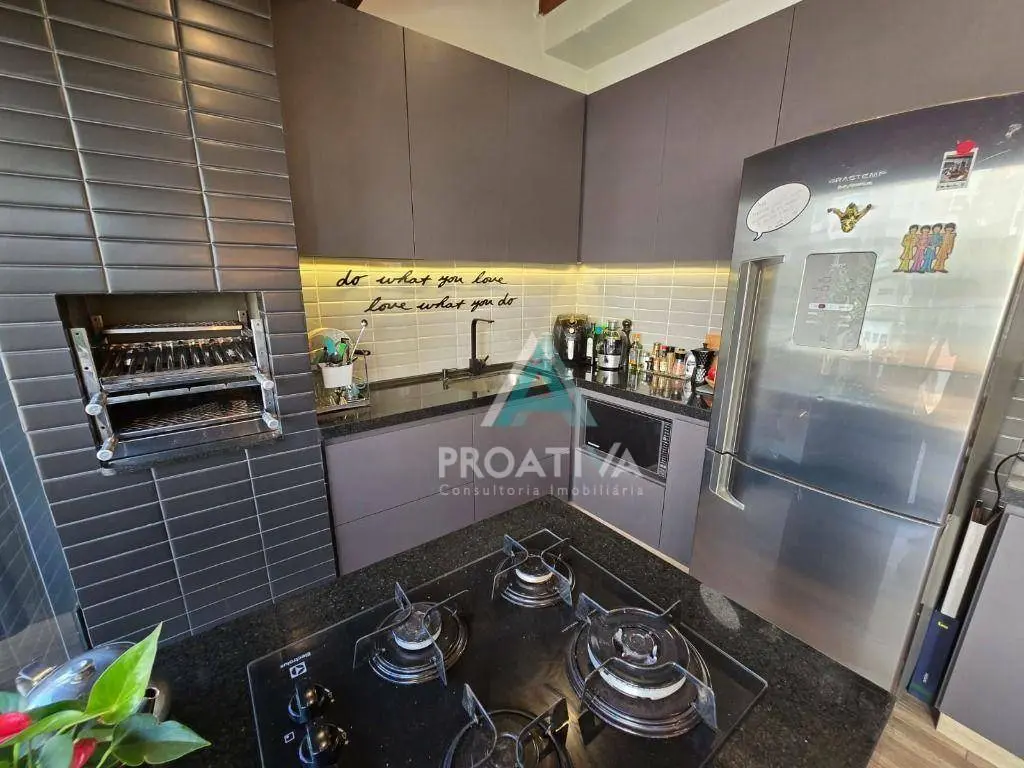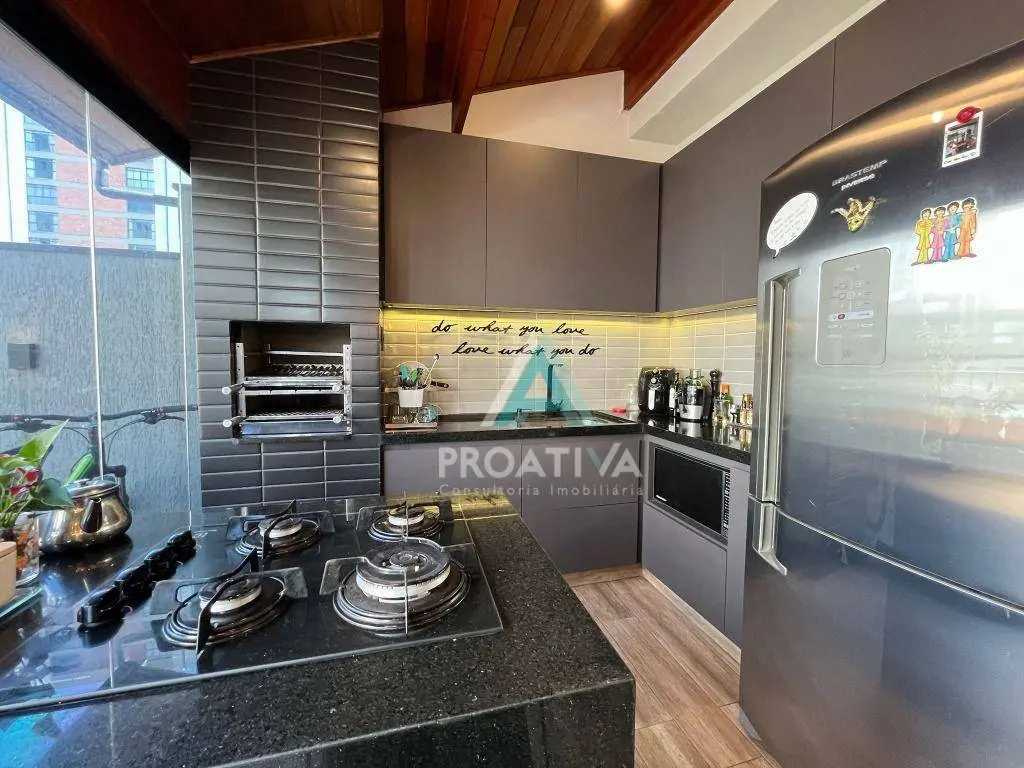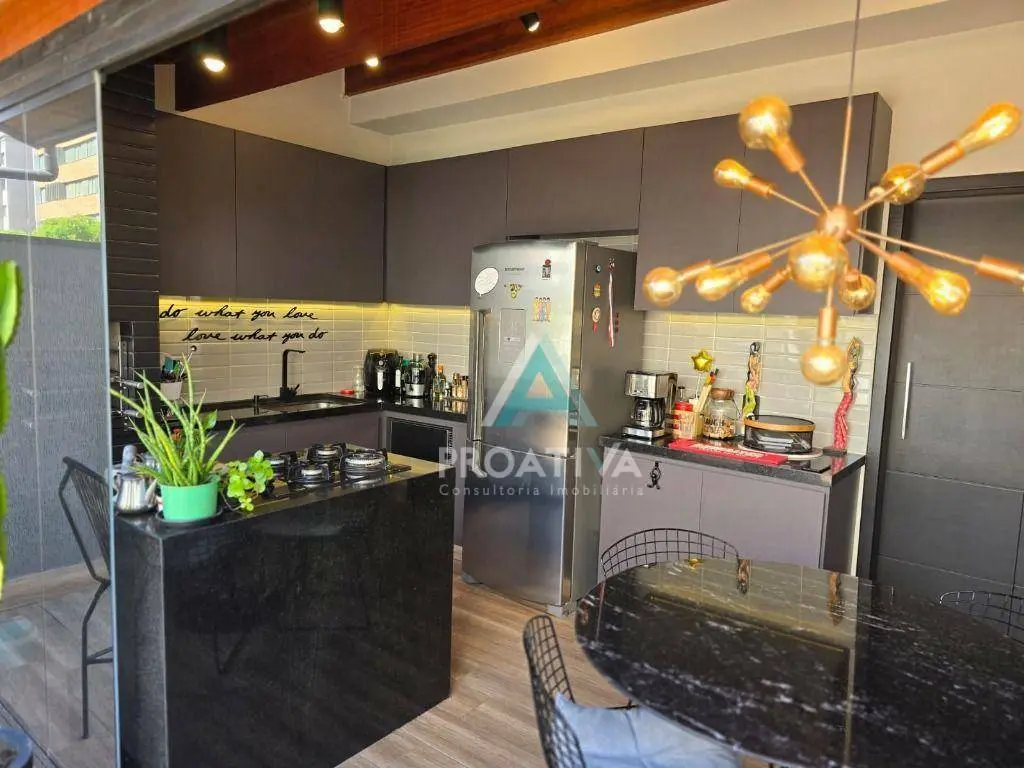 Cozinha moderna e funcional, com cooktop em ilha central, churrasqueira, ampla marcenaria planejada e envidraçamento total, garantindo integração com a área externa