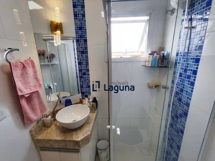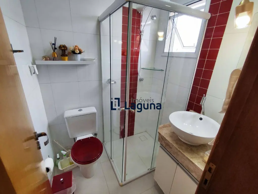 - Banheiro social com box de vidro, pastilhas decorativas e cuba sobreposta;