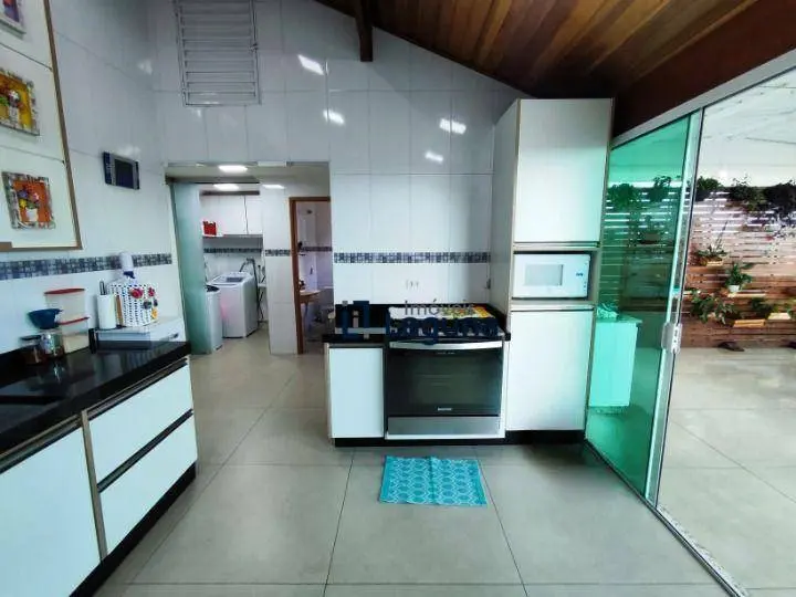 Amplo espaço gourmet com design moderno, fechado por portas e janelas de vidro ambiente conta com churrasqueira revestida, bancada com pia, armários planejados, fogão.