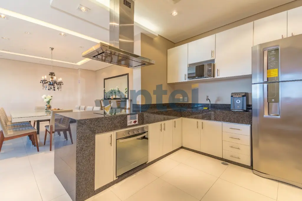 Cozinha equipada com geladeira, cooktop e microondas, mesa com cadeiras