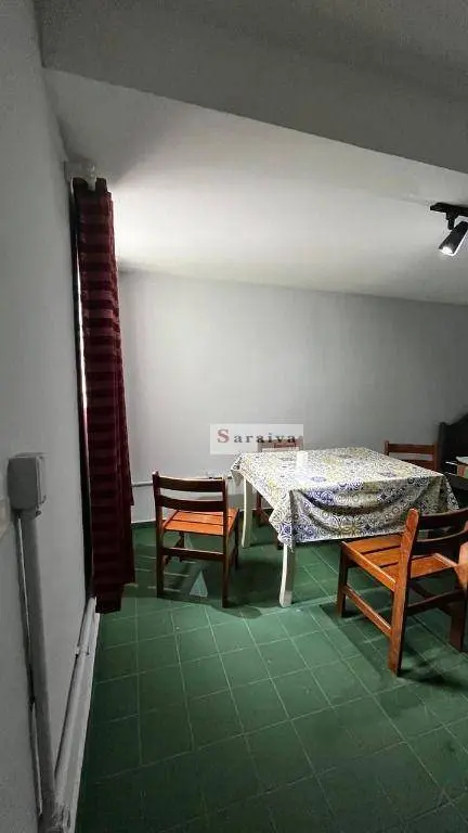 Imóvel com 1 dormitório com guarda-roupa, cama mesa com 4 cadeiras e mesinha, cozinha com geladeira, cooktoop e microondas e 1 banheiro.