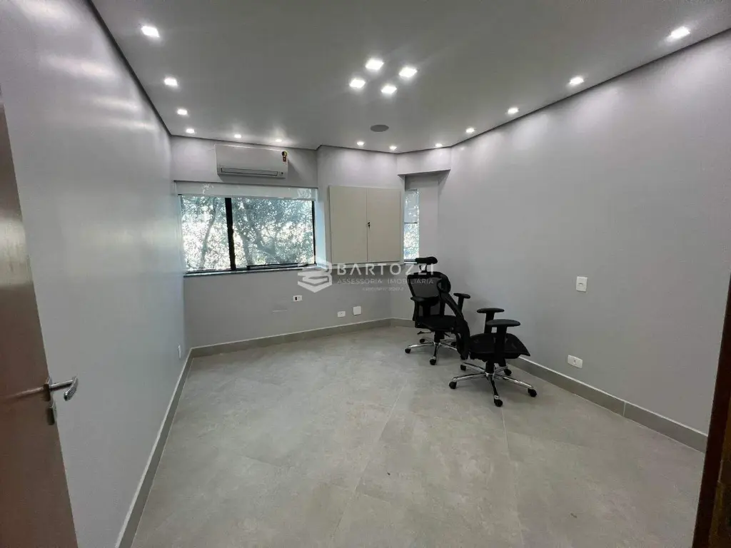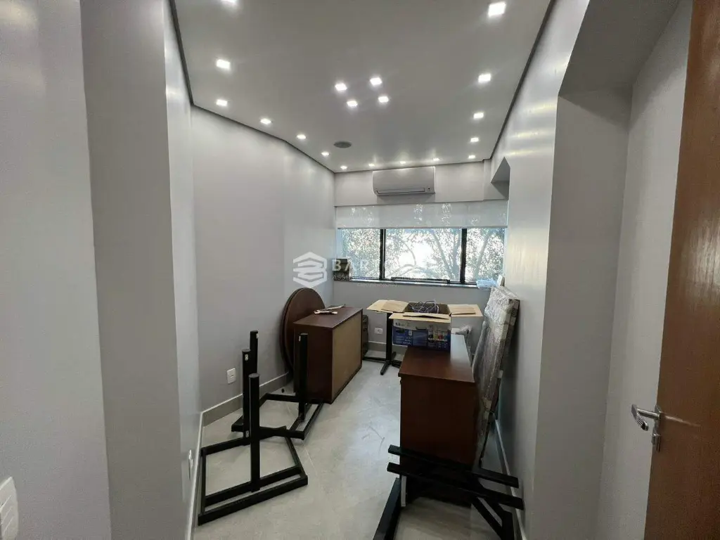 Sala reformada, bem iluminada, semimobiliada com 2 mesas redondas, 2 mesas com gaveteiro, 2 armários.