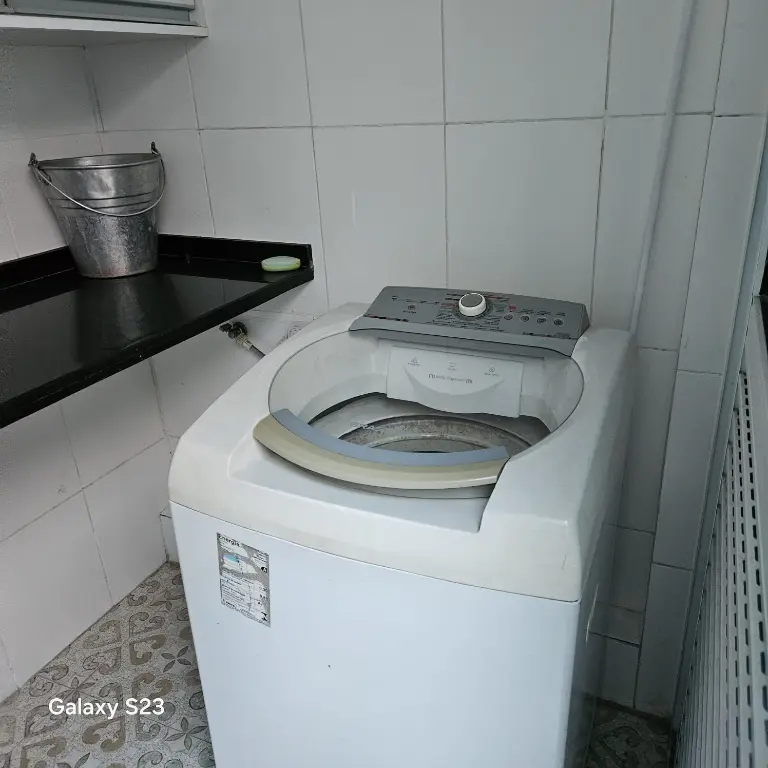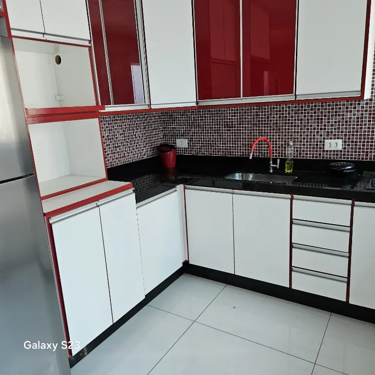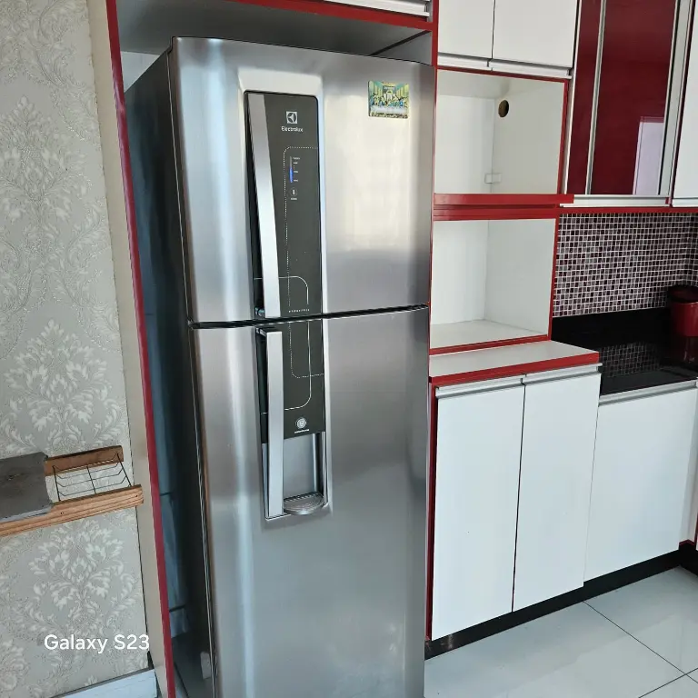 Geladeira, cooktop, máquina de lavar roupa, sofá e armários embutidos.