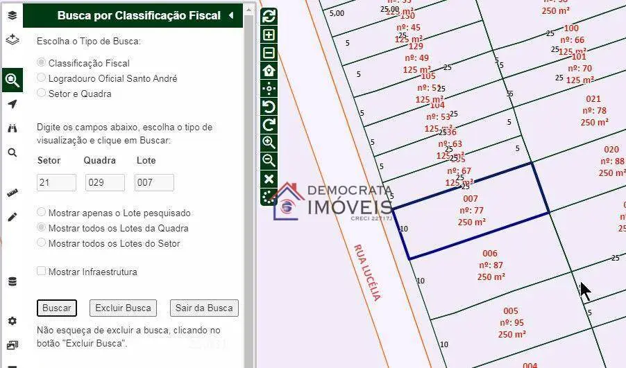 Terreno para venda com 250m² de área total e totalmente plano. Possui imóvel antigo no local com 121,78m² (estuque).
