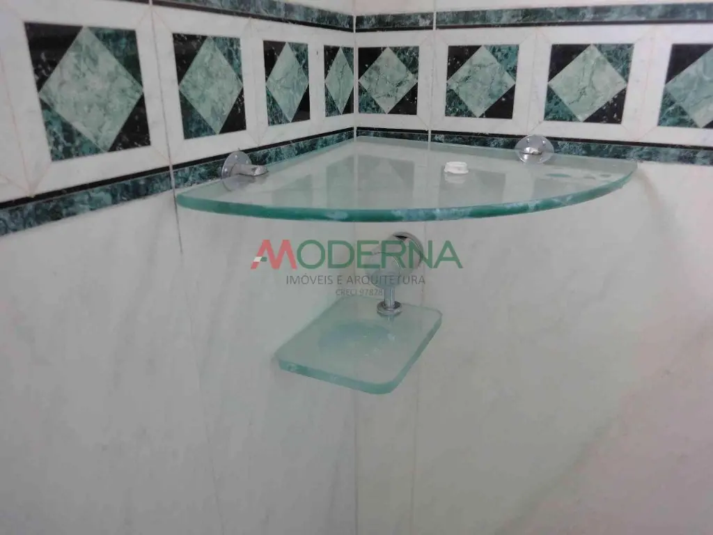 Banheiro com armário, box de vidro verde temperado, pia em vidro, espelho e luminária, piso e paredes revestidos em porcelanato espanhol.