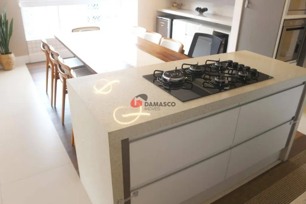 A área de lazer conta com churrasqueira, salas de estar e jantar, além de uma cozinha completa. E para os dias mais quentes, o ar-condicionado está disponível em todos os ambientes.