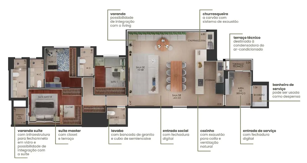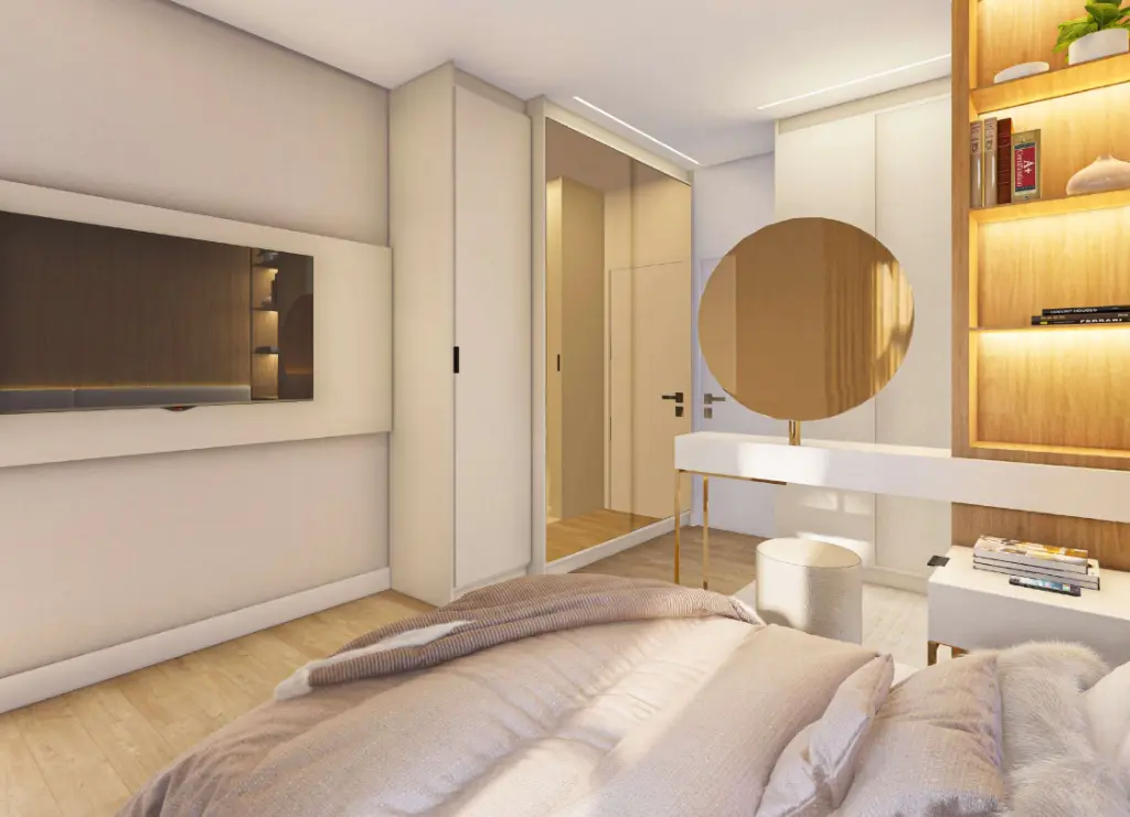 São apartamentos de 134 m² com 3 suítes sendo1 suíte máster com terraço e 2 ou 3 vagas de garagem determinadas.