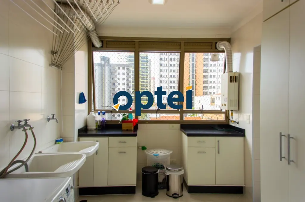 A área de serviço é completa e funcional, com cozinha espaçosa, copa para refeições, despensa, lavanderia ampla, dormitório e banheiro de serviço.