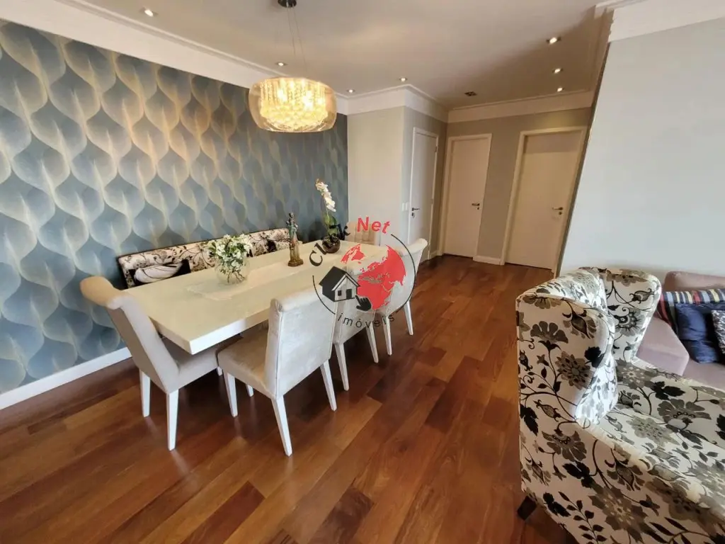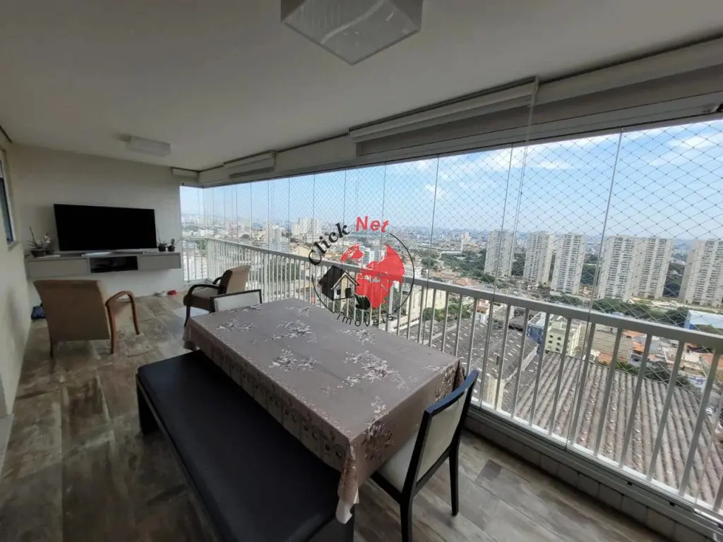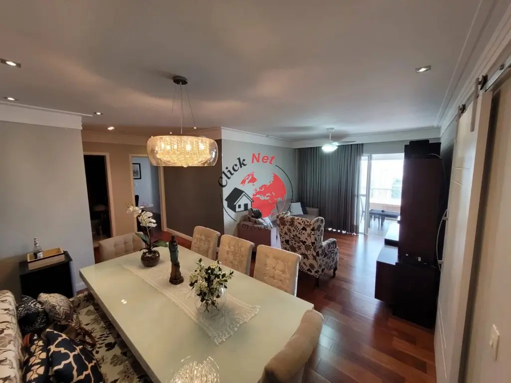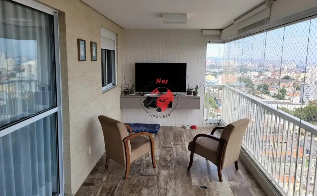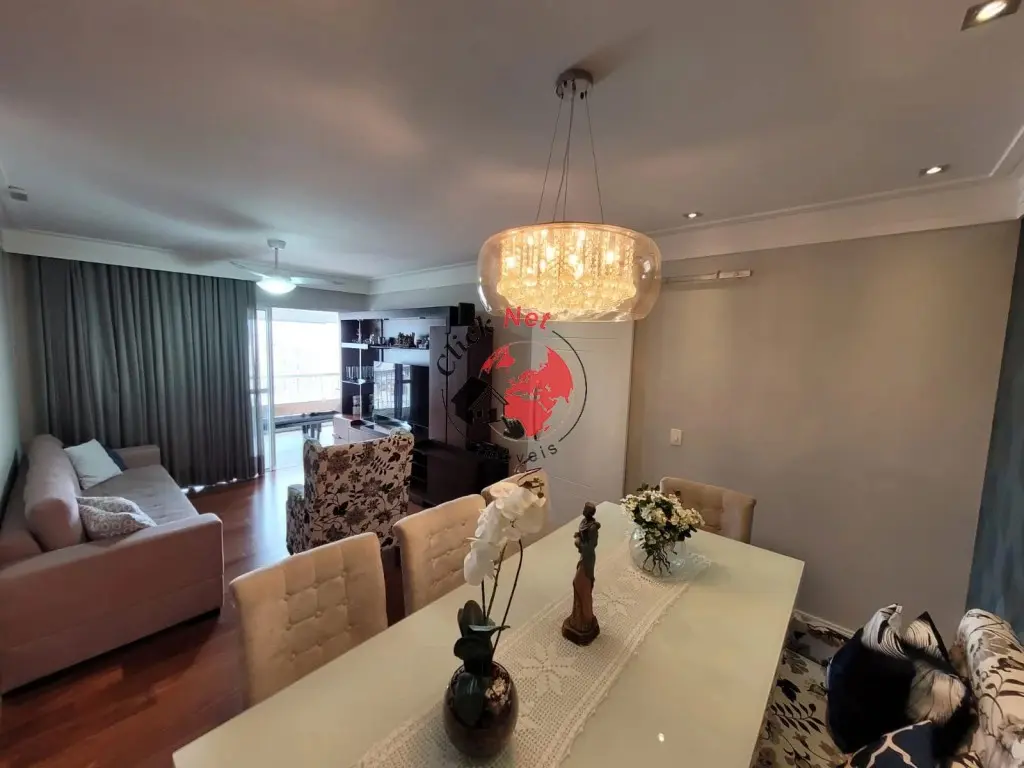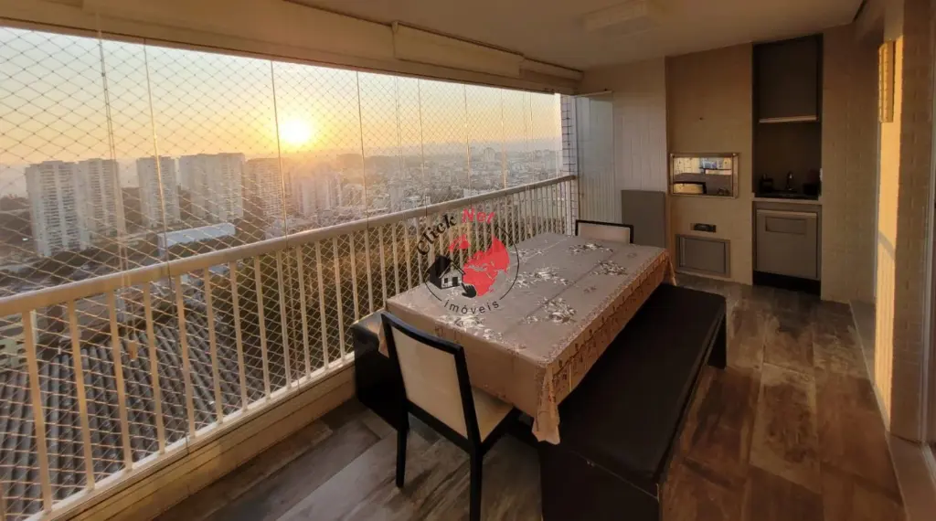 ?Sala de estar e jantar integradas à charmosa varanda gourmet envidraçada, com uma vista linda da cidade