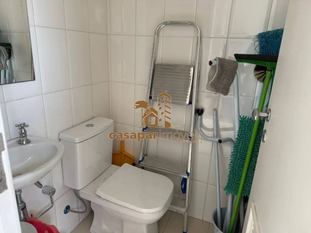 Cozinha ampla e com planejados, área de serviço com banheiro