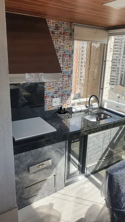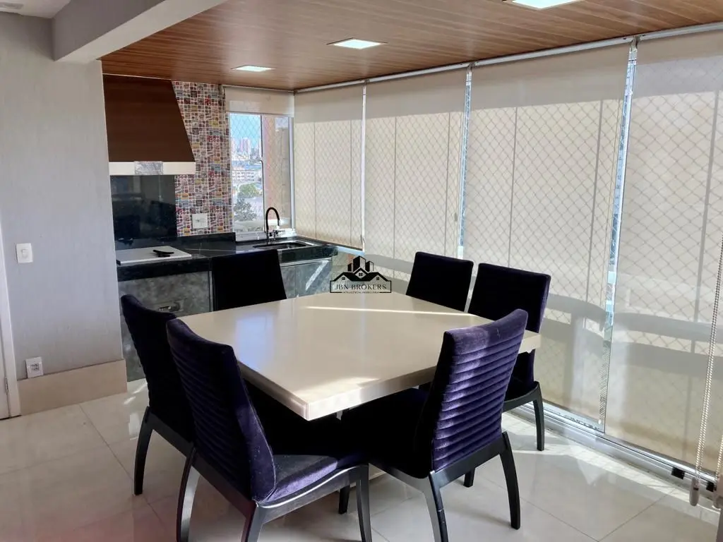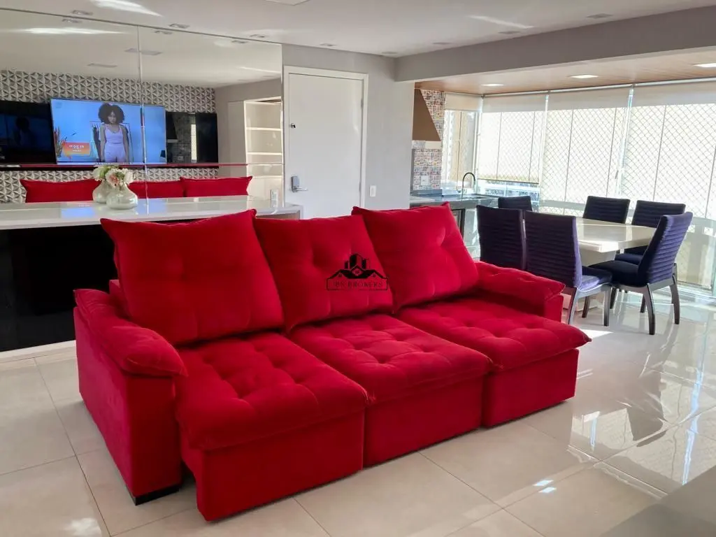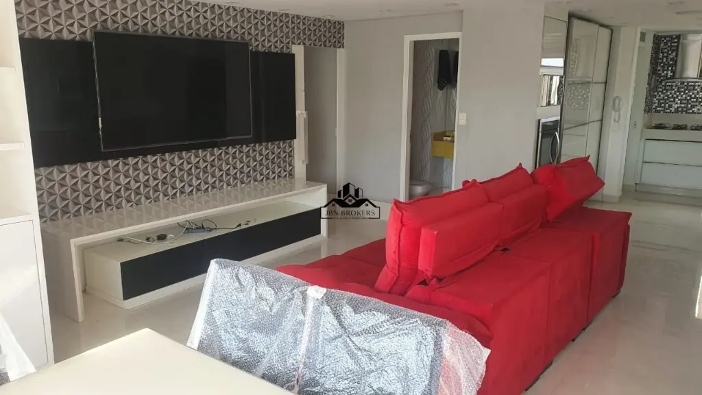 A sala de estar, iluminada e arejada, se conecta a uma varanda gourmet com churrasqueira, criando um espaço perfeito para entretenimento e apreciação da vista panorâmica da cidade.