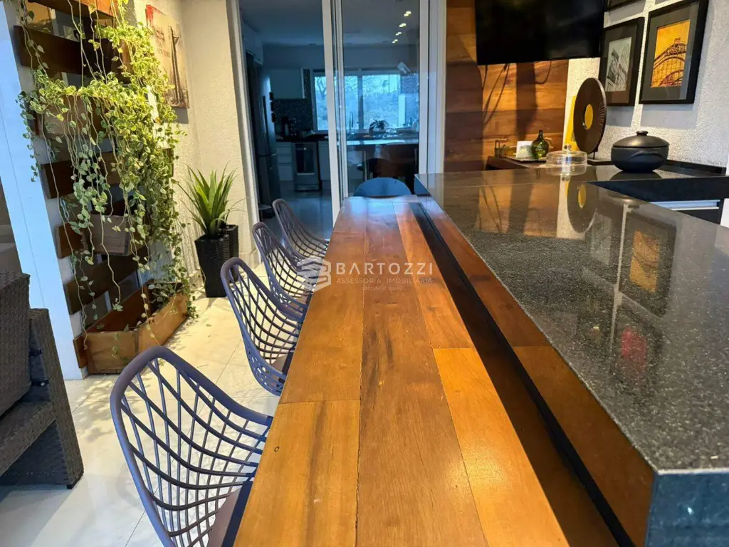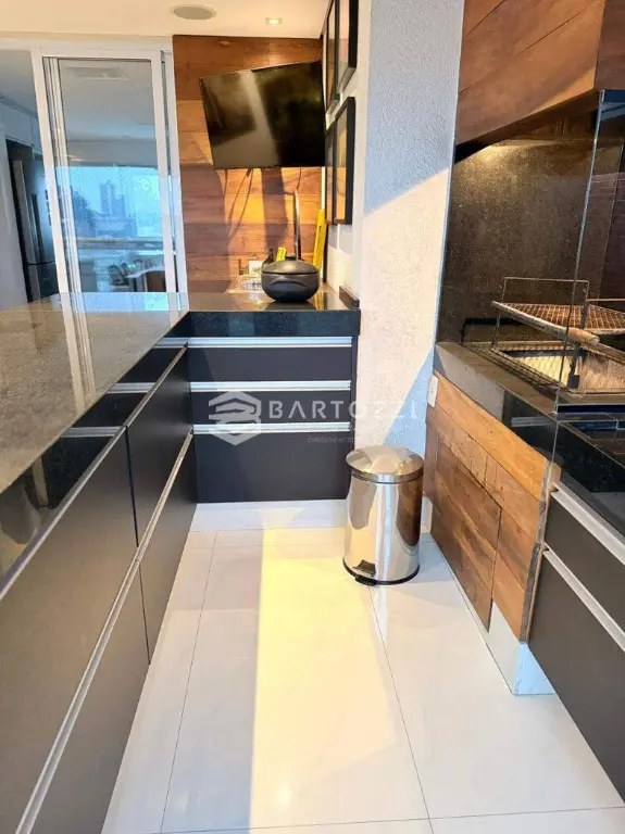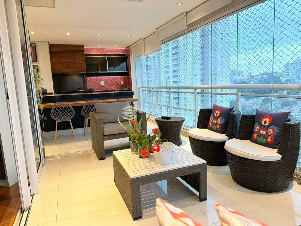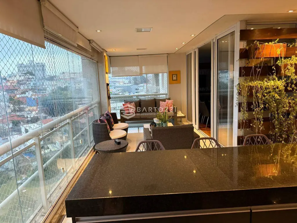- Varanda gourmet integrada a cozinha, decorada, envidraçada e com cortina roll on blackout