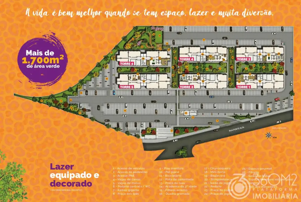 Lazer: Academia, Bicicletário, Brinquedoteca, Churrasqueira, Espaço Gourmet, Playground, Praça de Convivência, Quadra Poliesportiva, Redário, Salão de Festas, Salão de Jogos.