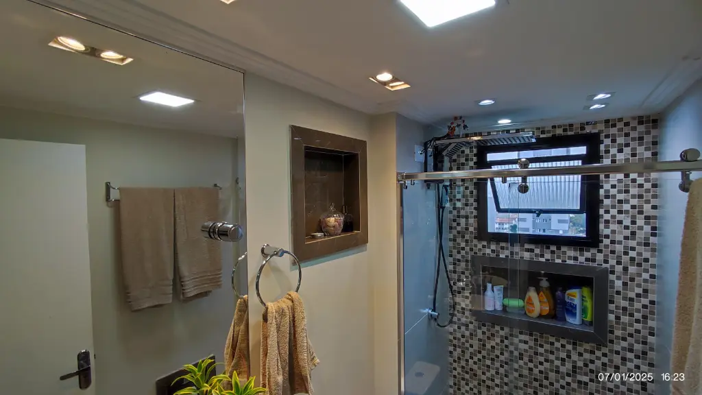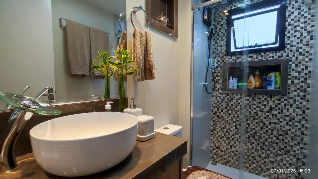 Quadro de PVC TIGRE, box IDEIA GLASS com vaso monobloco, nicho no BOX, Nicho decorativo e nicho de papel/lenço úmido, gás encanado.