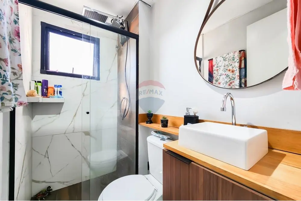 Banheiro em porcelanato e com box de vidro, oferecendo elegância e durabilidade.