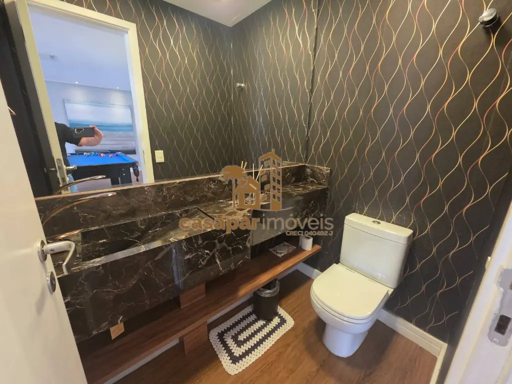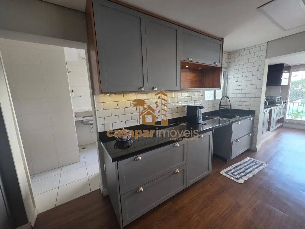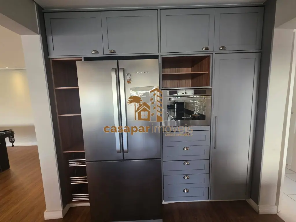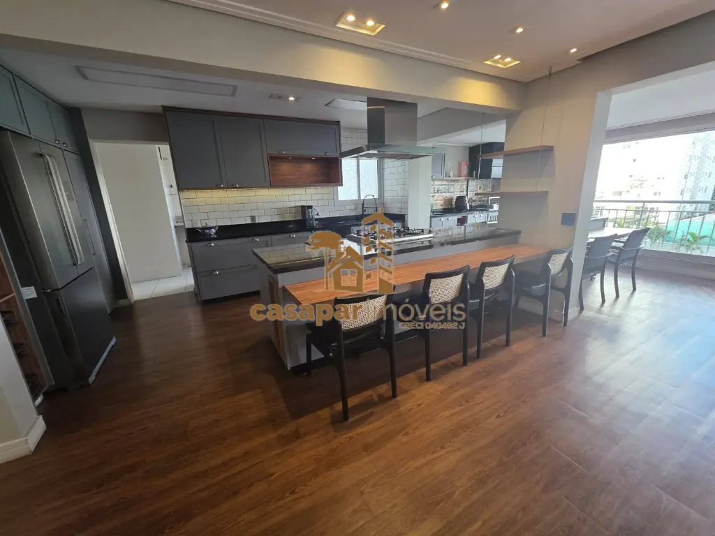 A cozinha conceito aberto também conta com armários planejados e equipada, além de uma área de serviço com banheiro e dispensa.