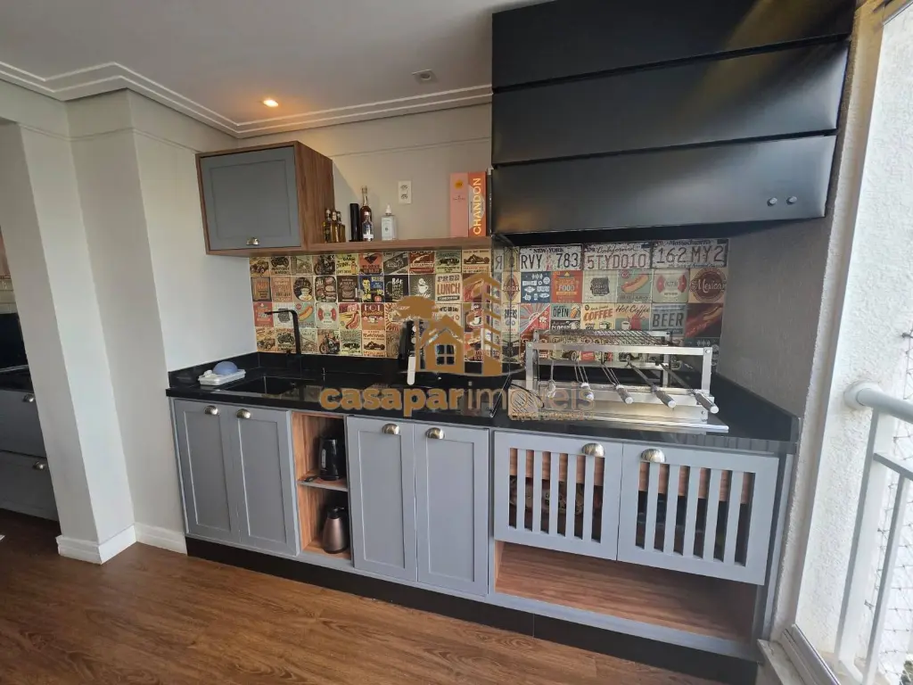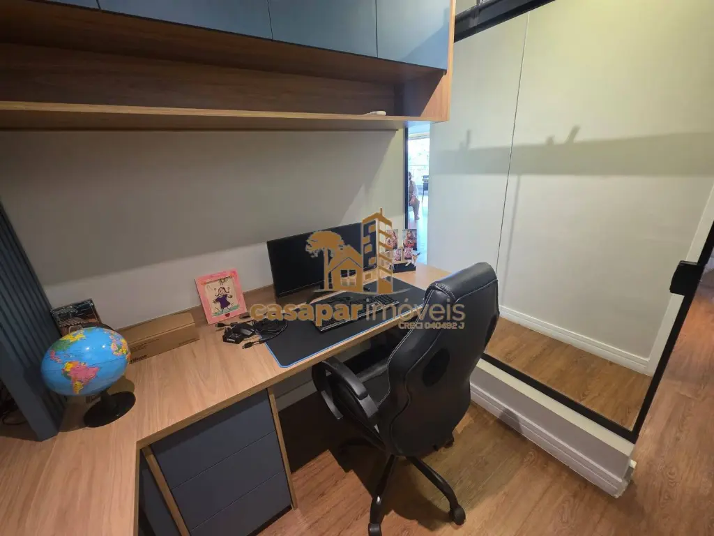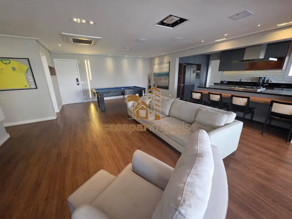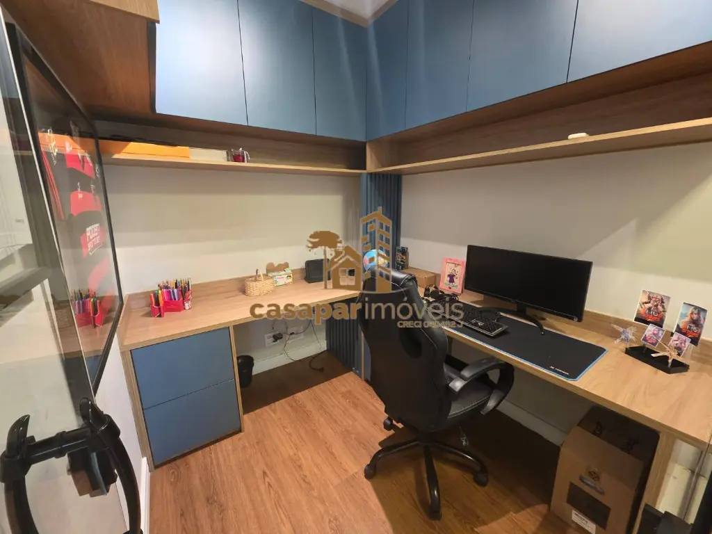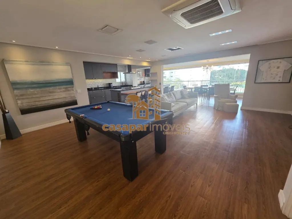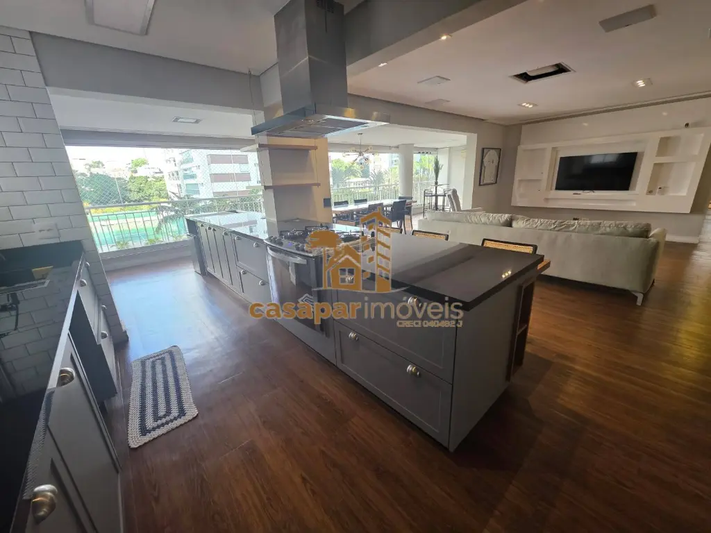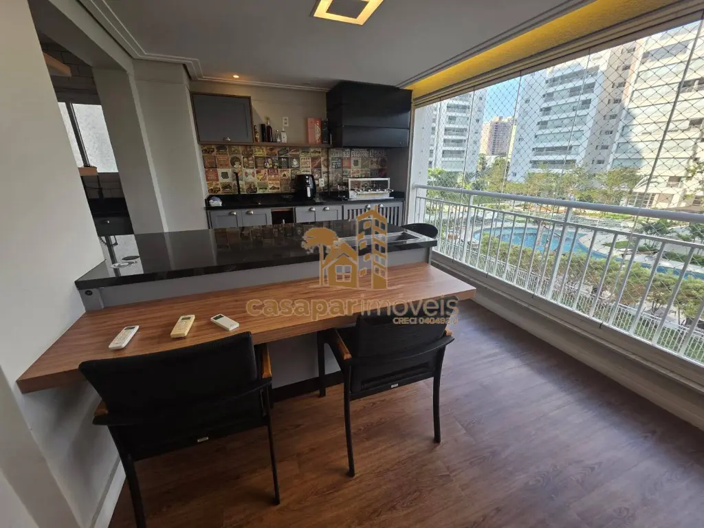 A sala é ampla e possui dois ambientes com ar condicionado, lavabo, um home office e uma sacada gourmet fechada em vidros com ar condicionado e churrasqueira, perfeita para momentos de lazer.
