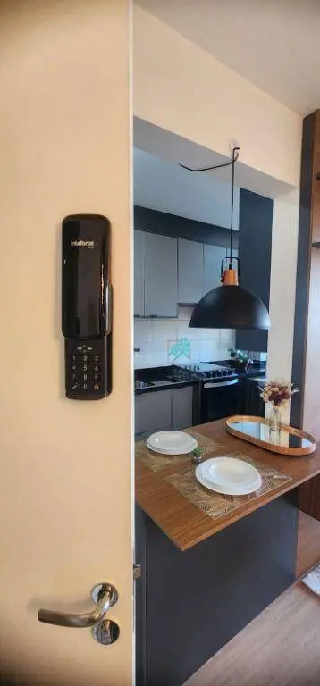 Acabamentos de alta qualidade com móveis planejados novos e bem cuidados, fechadura eletrônica na porta.