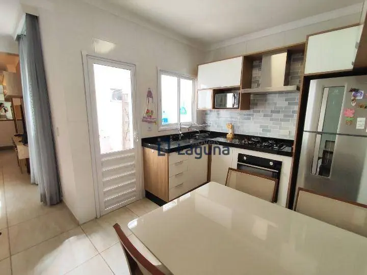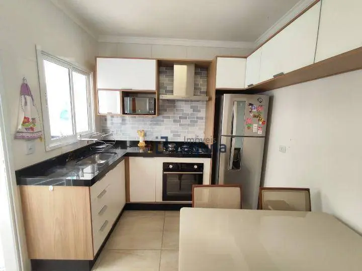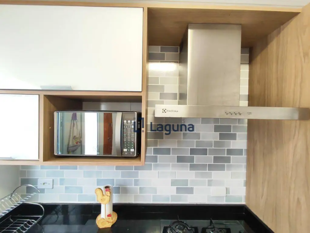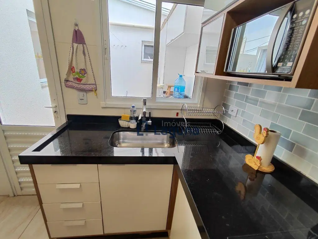 - Cozinha com planejados, totalmente equipada com cooktop, forno, coifa, micro-ondas, geladeira, mesa com quatro cadeiras.