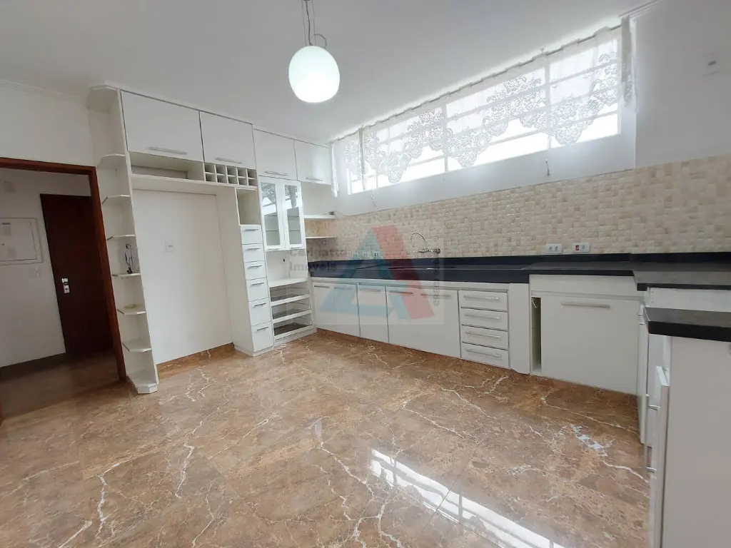 Cozinha espaçosa e planejada, integrada à ampla área de serviço com banheiro de apoio
