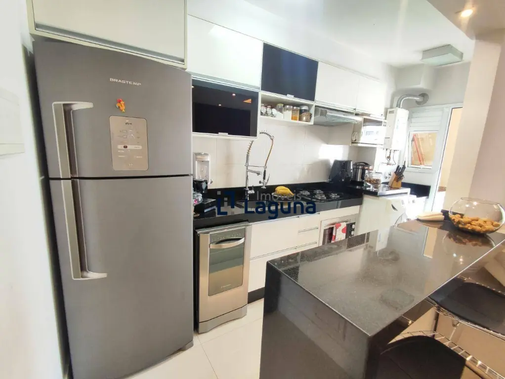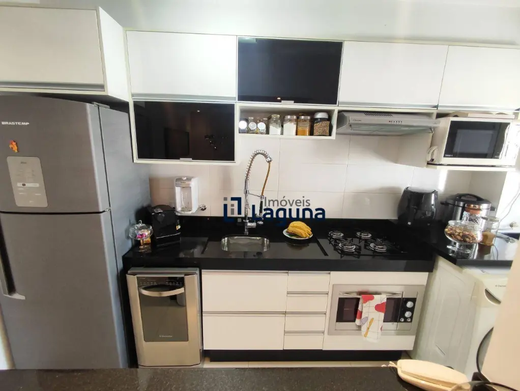 - Cozinha americana com móveis planejados e eletrodomésticos inclusos: geladeira, cooktop, forno elétrico, micro-ondas e coifa.