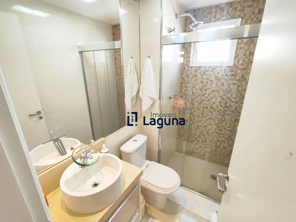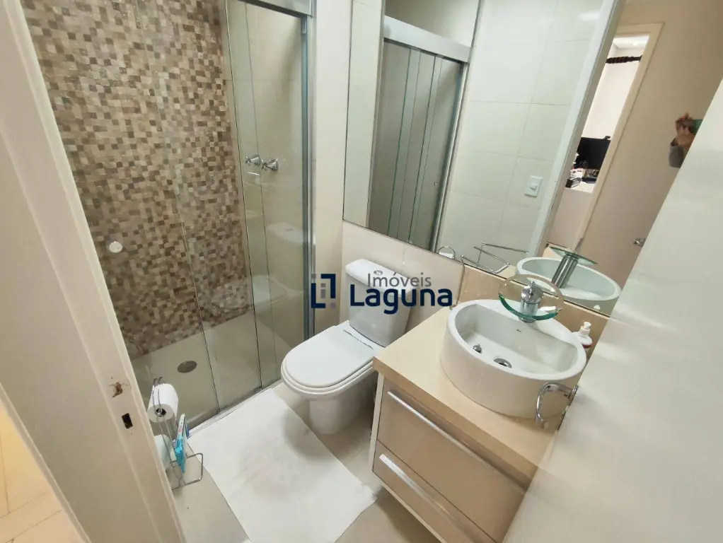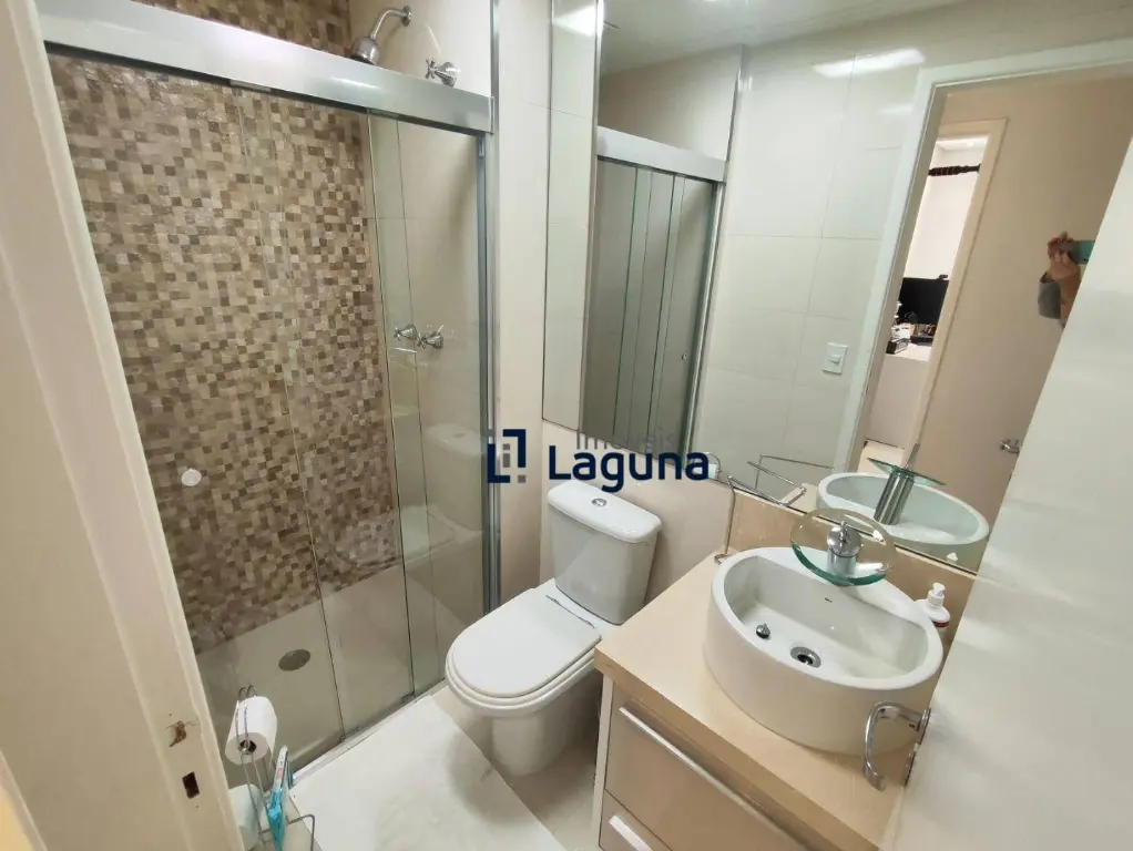 - Banheiros com armários sob medida, espelhos amplos, box de vidro e ducha de alta pressão.