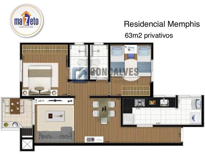 Venda de apartamento residencial no Campestre, Santo André. Imóvel com 63 m² de área útil, 2 quartos (1 suíte), 2 banheiros, sala 2 ambientes com varanda gourmet e área de serviço. Distribuição prática com 1 vaga de garagem e 2 elevadores. Localização estratégica no bairro Campestre, oferecendo conforto, praticidade e infraestrutura para quem busca qualidade de vida.