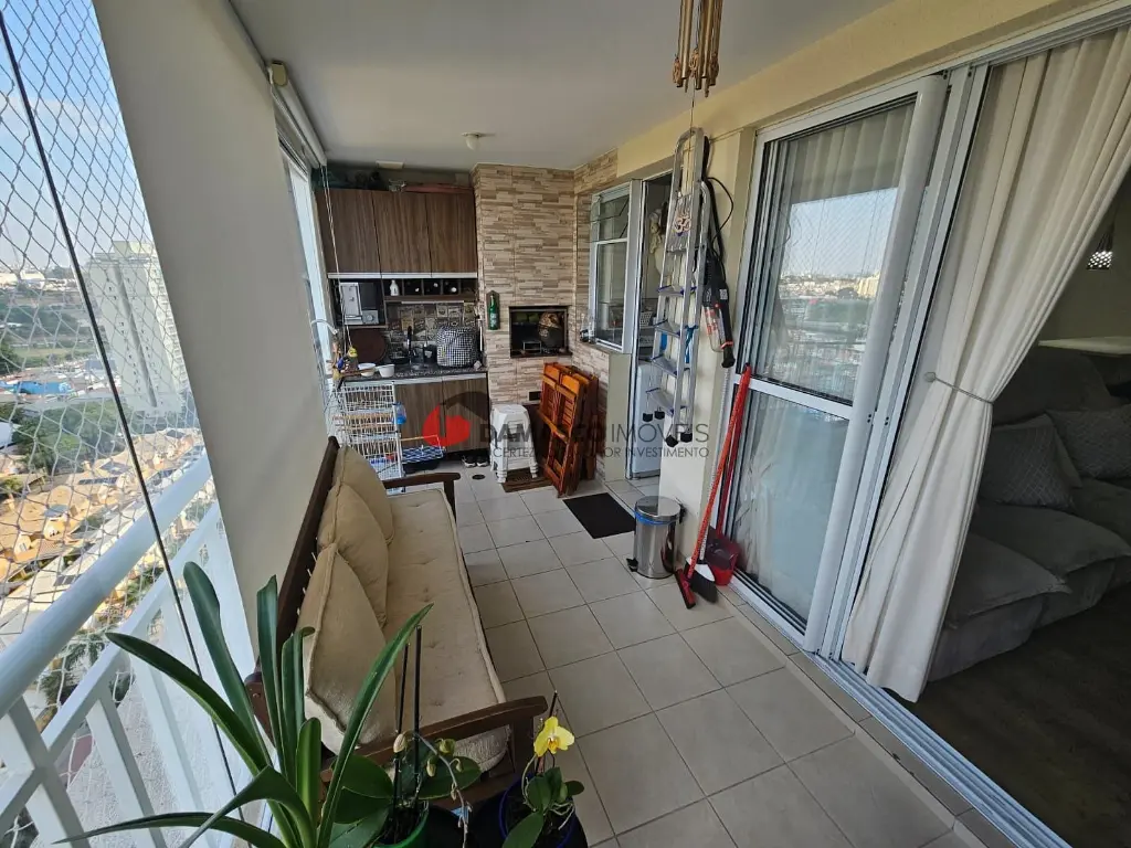 Sala ampla com sacada, skin glass e churrasqueira, ideal para momentos de lazer e convivência