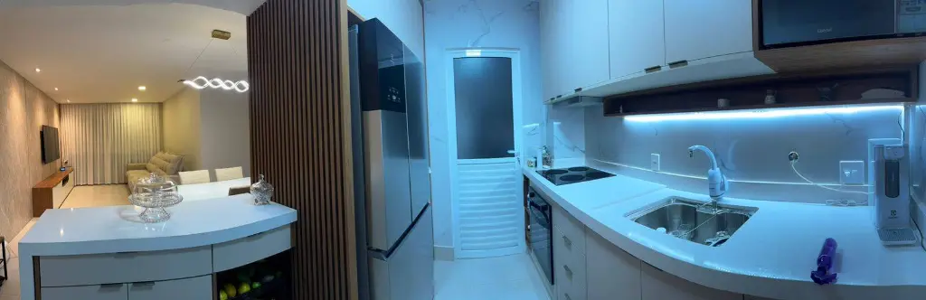 A cozinha, no estilo americana, é rica em planejados, assim como a área de serviço.