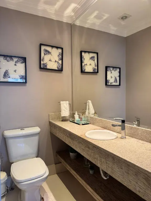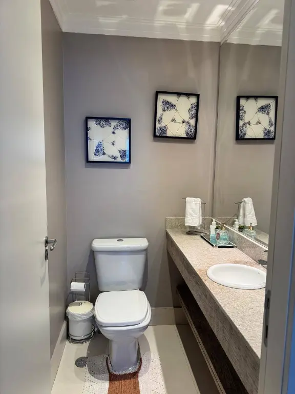 Há ainda um lavabo e duas vagas de garagem cobertas ao lado do elevador.