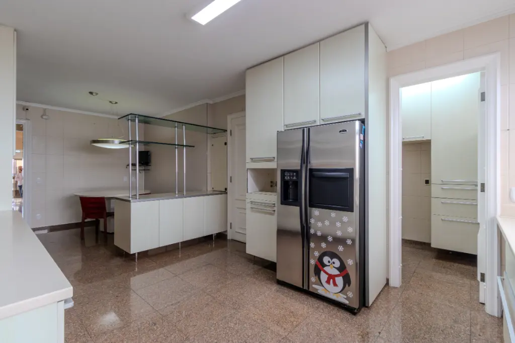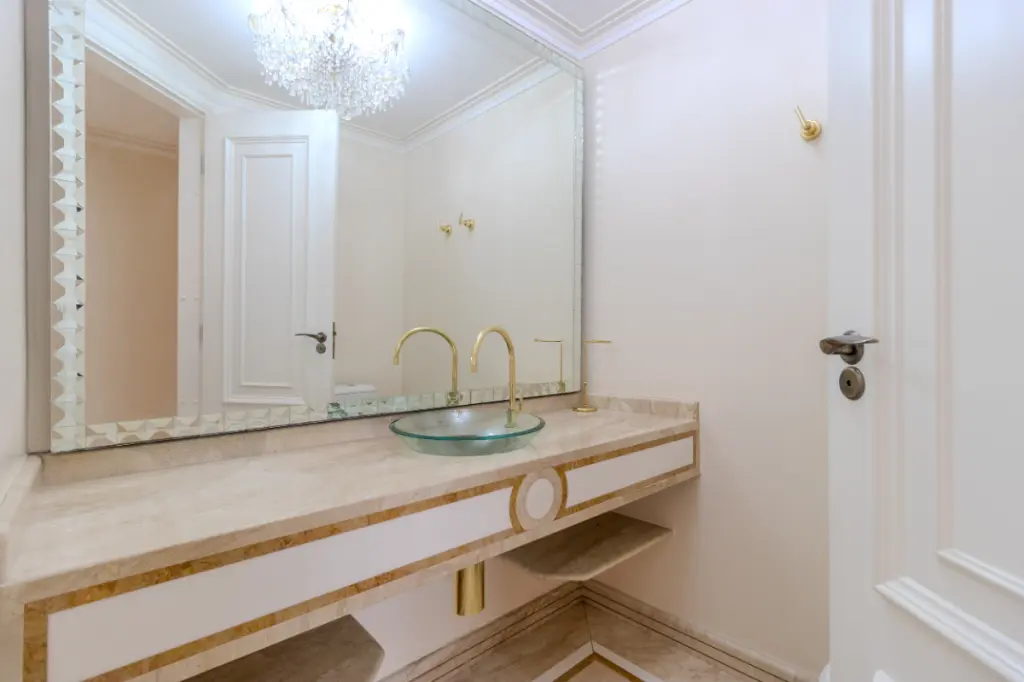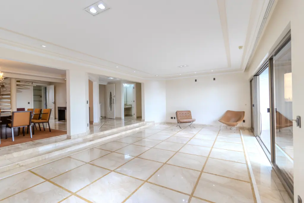 O requinte é perceptível ao primeiro passo. O imóvel é inteiramente revestido com acabamentos em mármore de altíssima qualidade, conferindo frescor e imponência a todos os ambientes. A transição entre os pavimentos é uma experiência à parte: a escadaria principal e as portas de entrada são adornadas com exclusivos vitrais italianos, que banham o ambiente com uma luz artística e única.