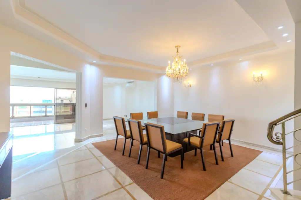 Piso Inferior (Social e Íntimo): Onde o conforto encontra a nobreza. São 4 suítes amplas, salas de jantar e estar integradas a uma varanda com vista panorâmica. A área de serviço é completa, contando com cozinha planejada, despensa e suíte de serviço.
