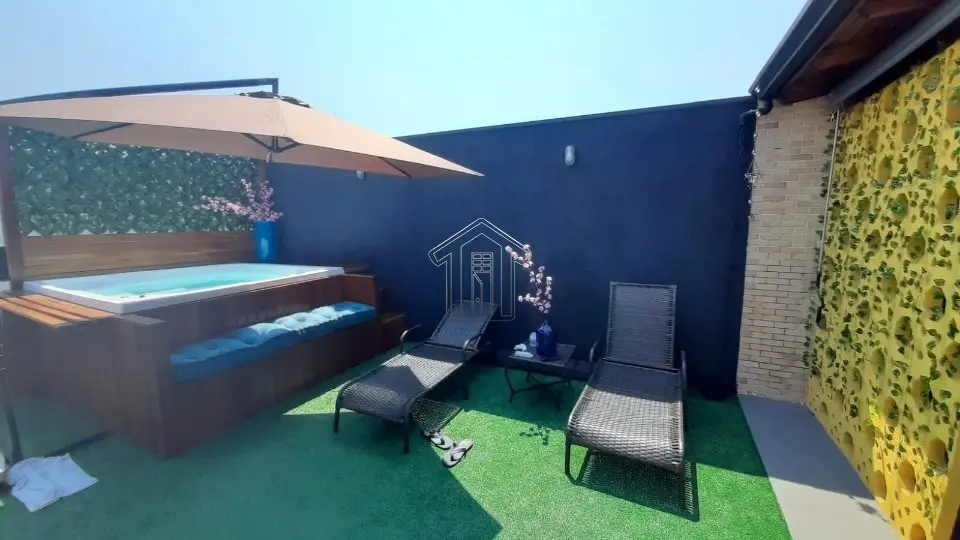 37 m2 de Área gourmet com churrasqueira, armários e banheiro- 30 m2 de Gramado artificial com 2 espreguiçadeiras