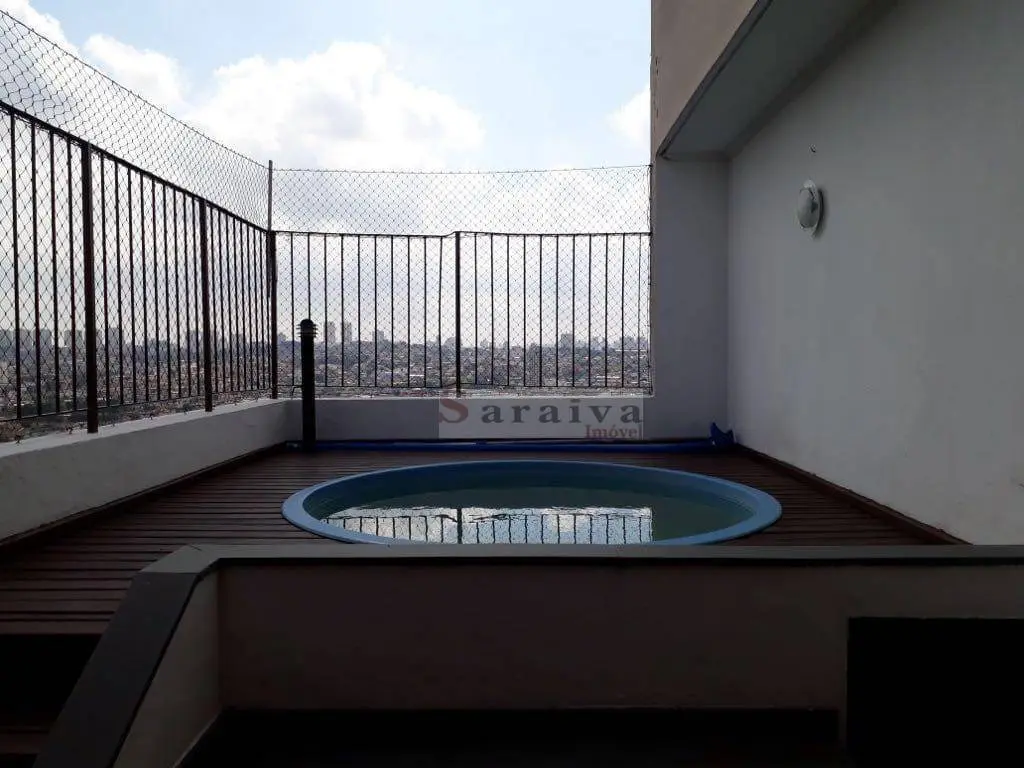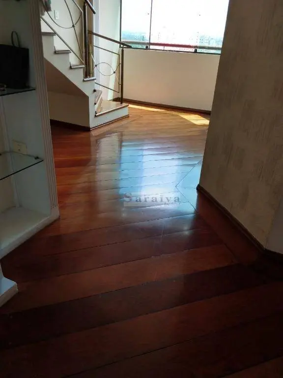 Cobertura duplex com 3 quartos, com 2 suítes, 4 banheiros, cozinha com armários, duas salas, piscina e churrasqueira privativas, piso de madeira, teto com sanca, 2 vagas de garagem.