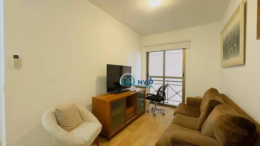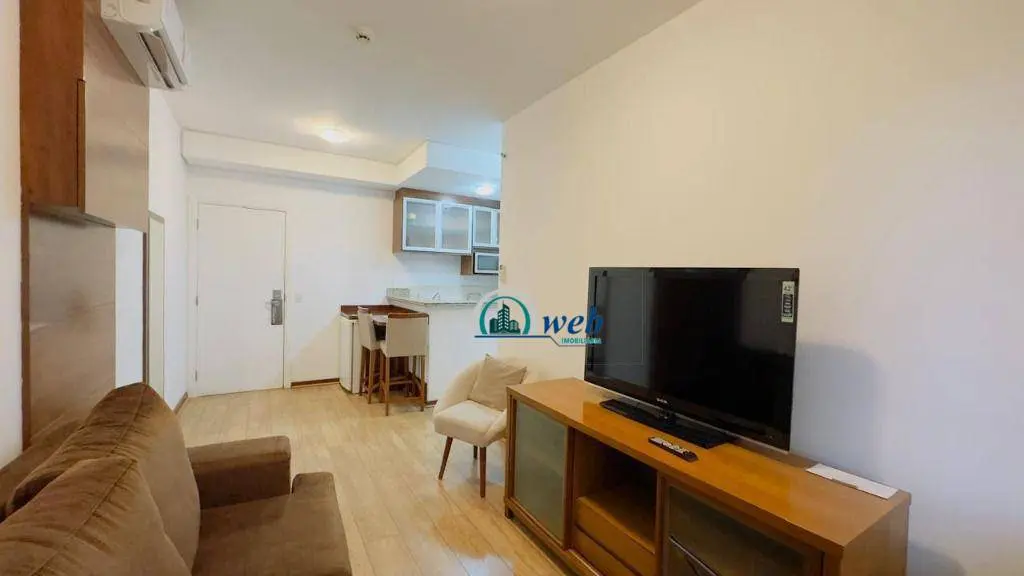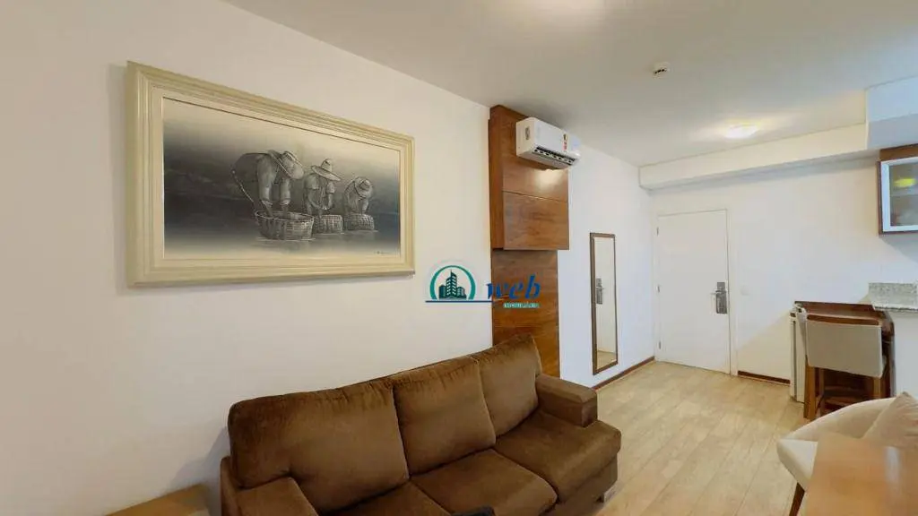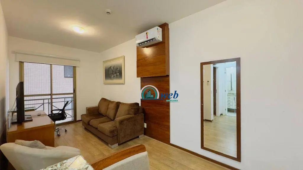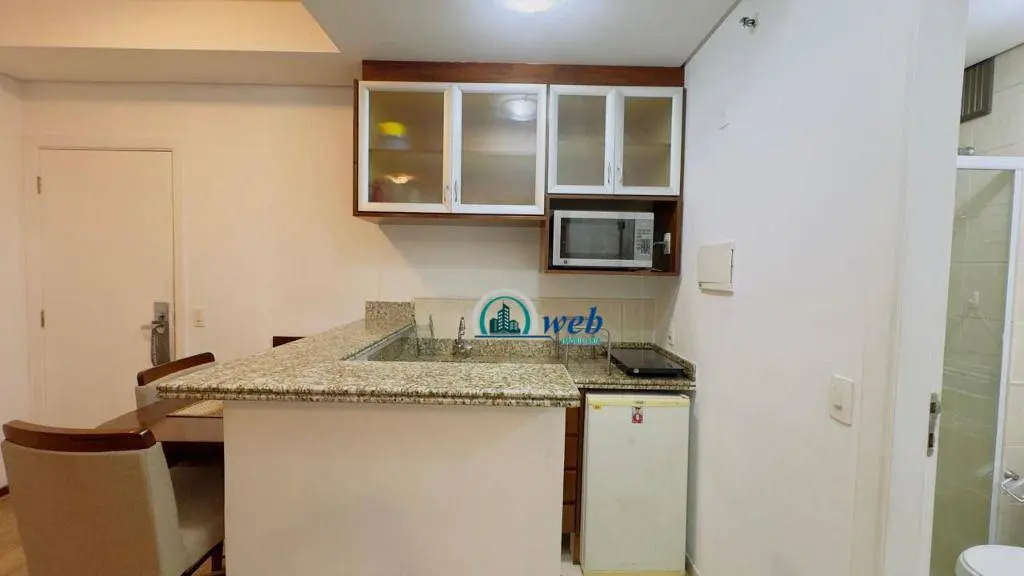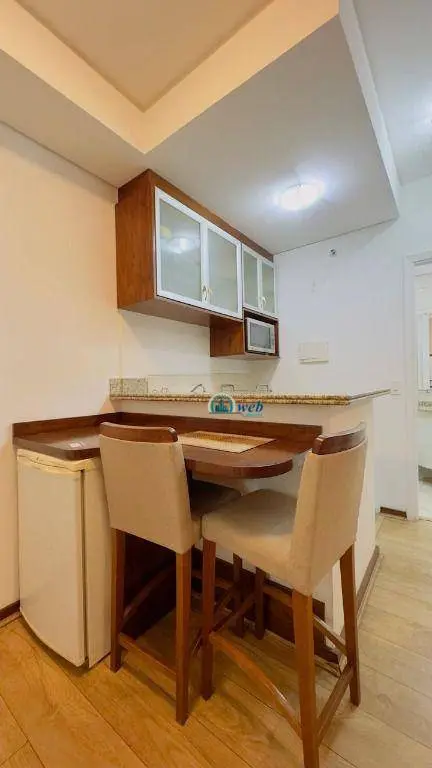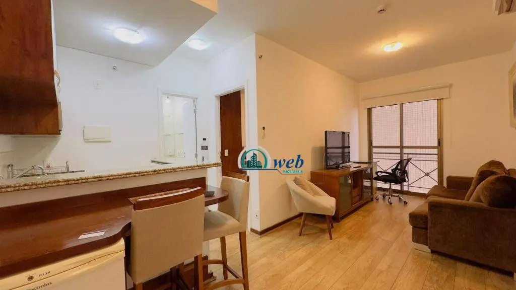 37 mts², 1 dormitório, sala 2 ambientes com sacada, cozinha, wc social, 1 vaga de garagem com manobrista. Apto todo mobiliado como nas fotos.