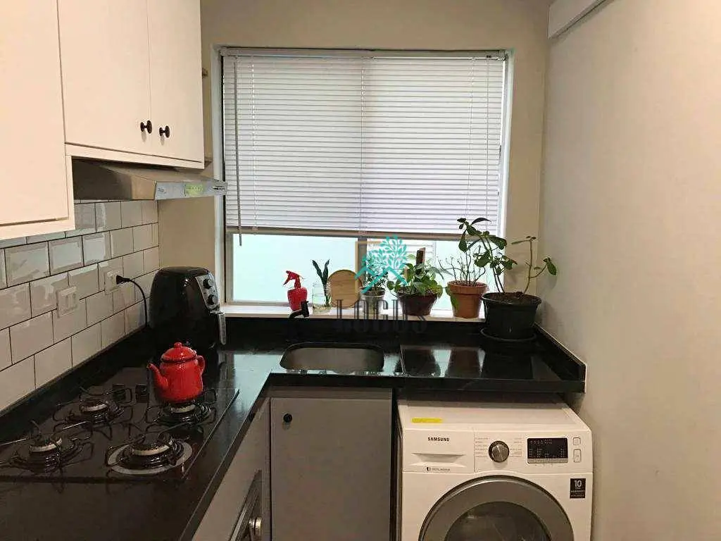 Cozinha completa com Cooktop, forno elétrico e depurador de ar, 1 WC com armário e box de vidro, sala aconchegante com estante, sofá, ventilador de teto e pendentes, área de serviço com lava e seca e 1 vaga de garagem coberta.