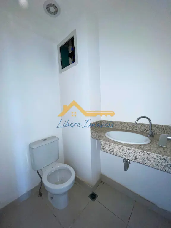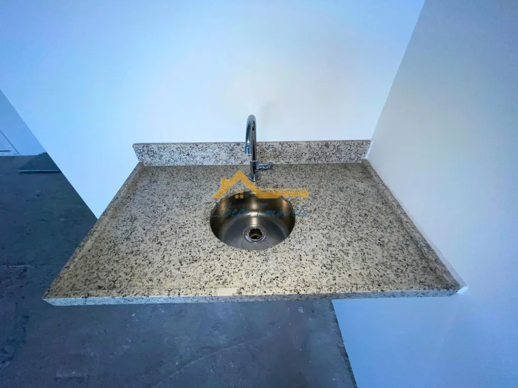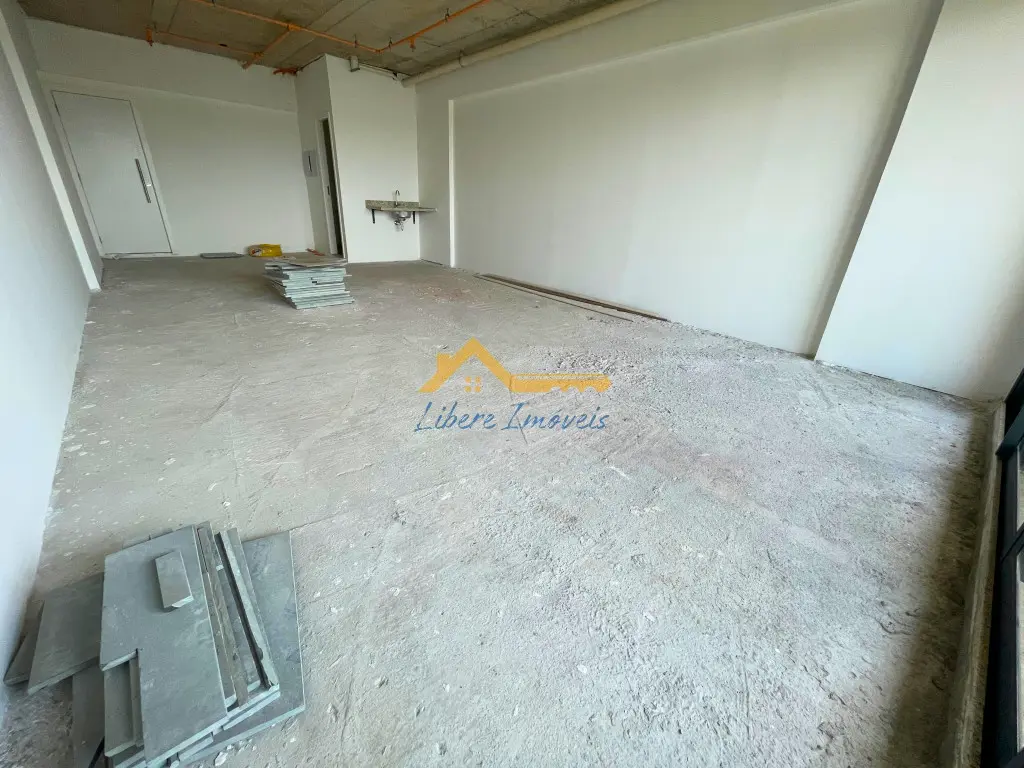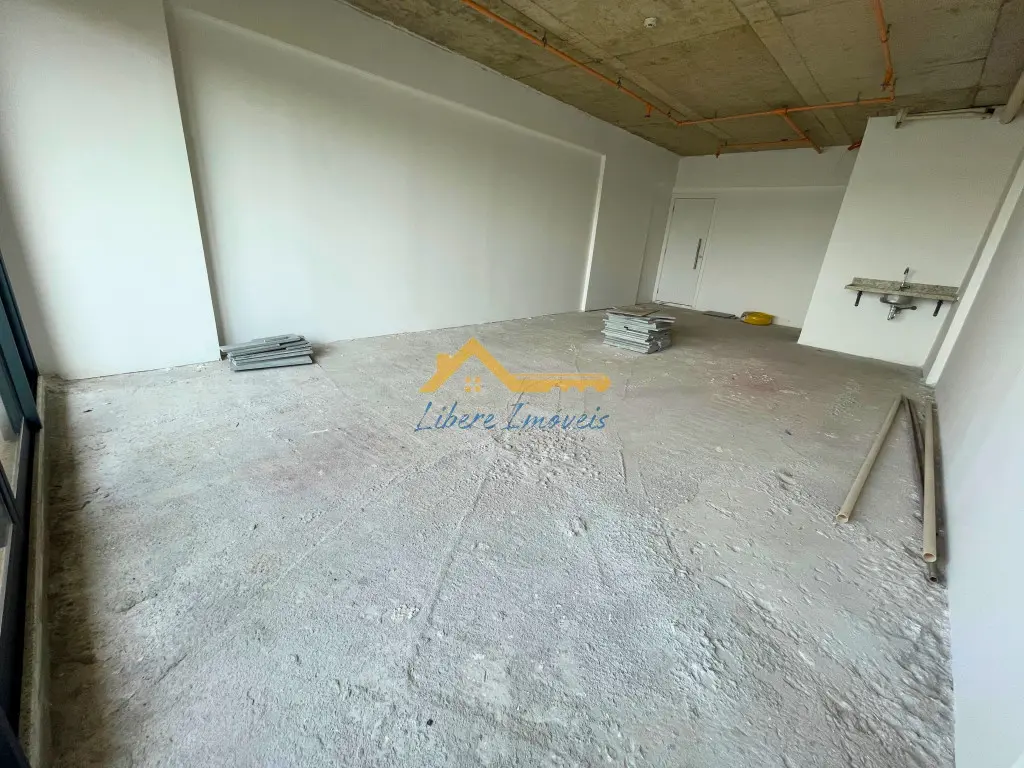 O interior da sala está no contrapiso, permitindo que o futuro ocupante personalize o layout e os acabamentos conforme a necessidade do seu negócio. O espaço possui ponto de copa com bancada em granito e cuba instalada, além de um banheiro privativo já equipado. A planta retangular facilita a distribuição de estações de trabalho, recepção e áreas de atendimento.