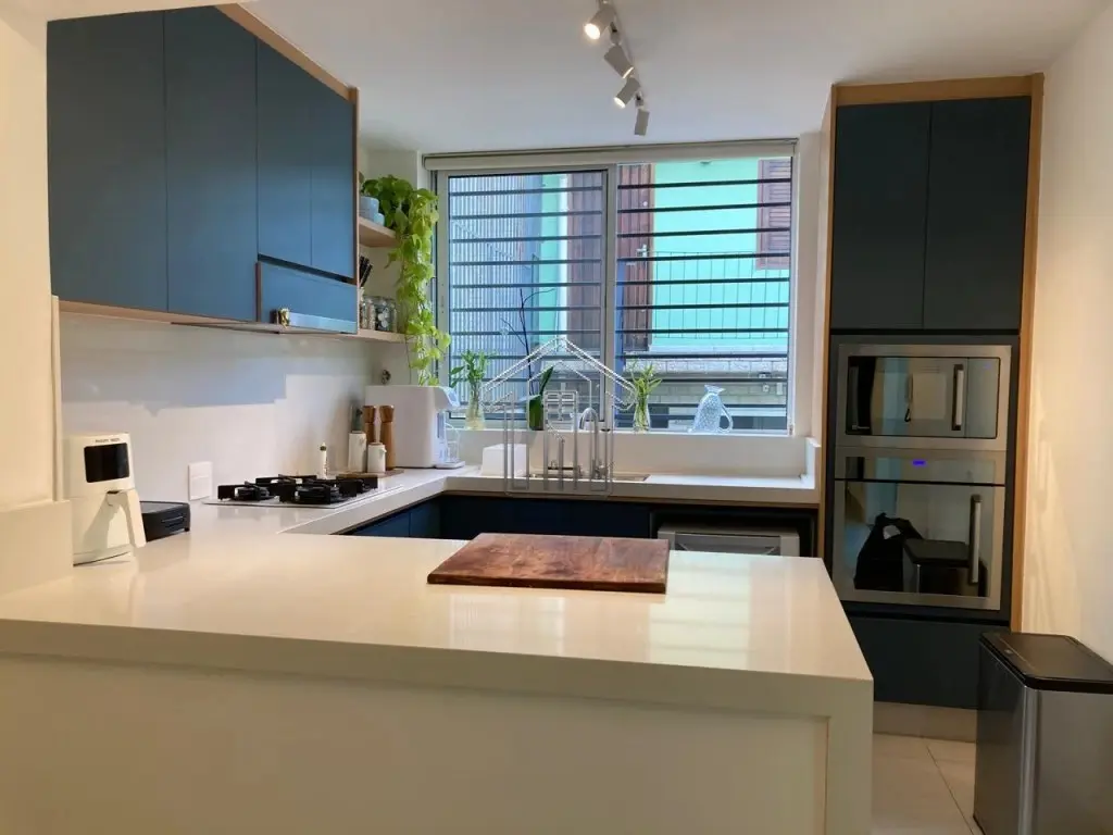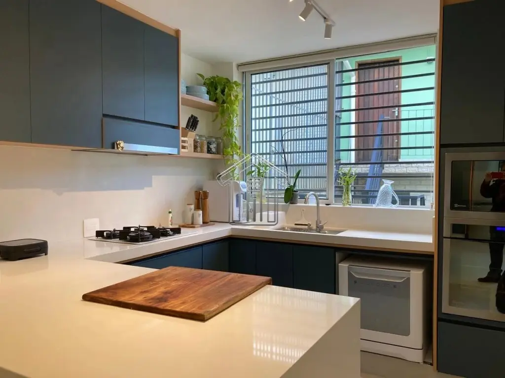 Copa/cozinha, com armários planejados, cooktop e depurador de ar