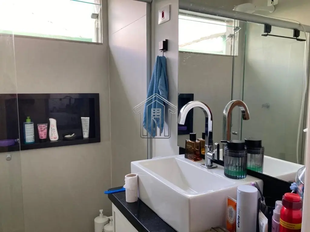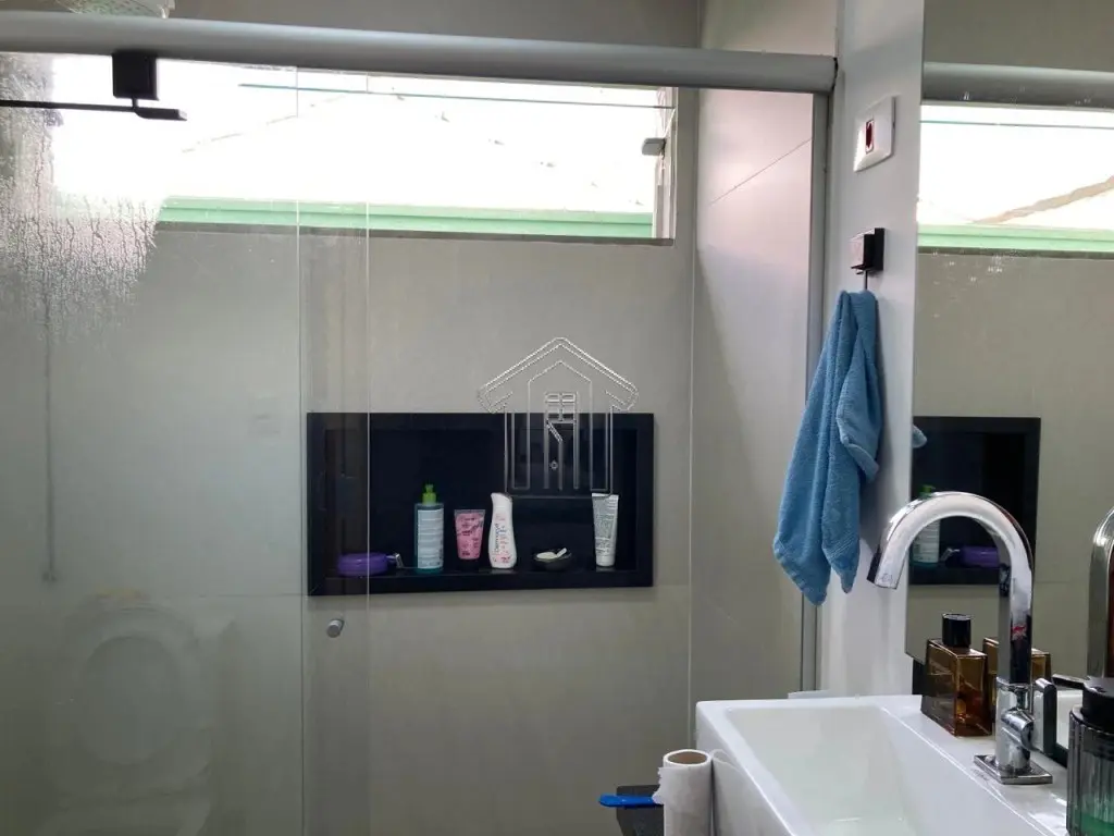 Banheiro social, com box de vidro e gabinete