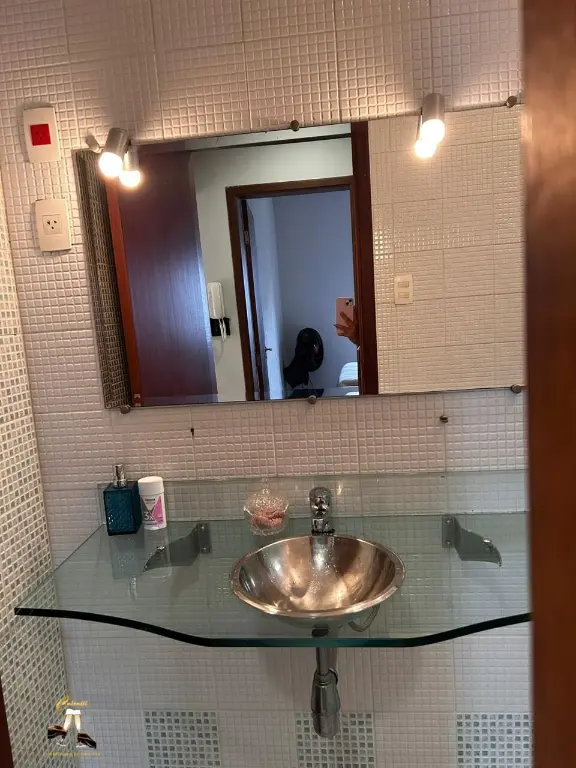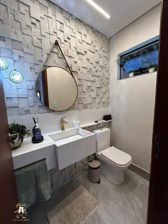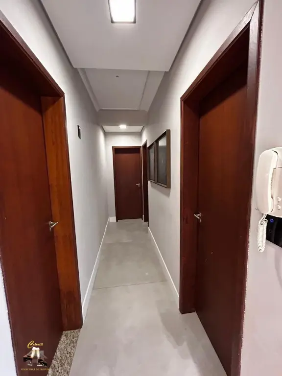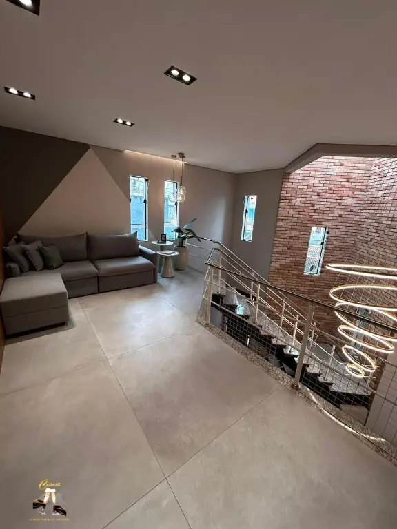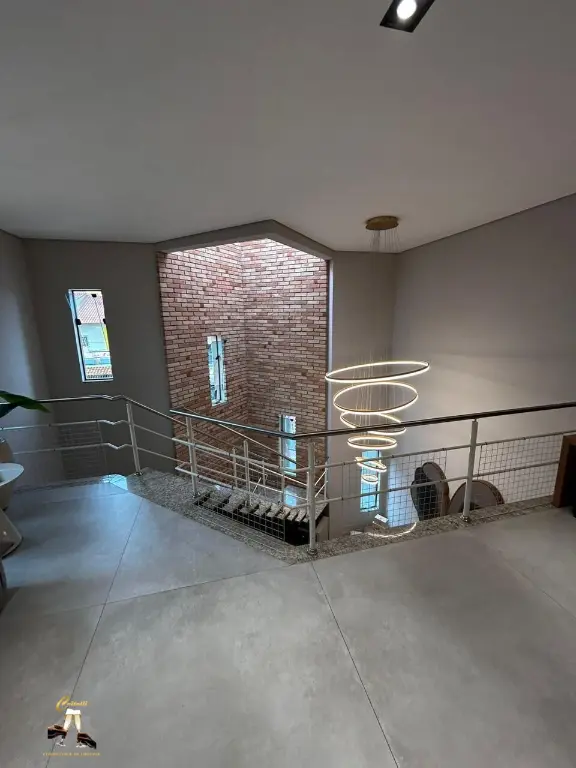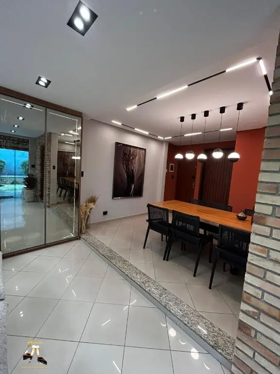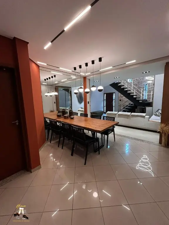 Com entrada social e de servic¸o, claraboia, sistema de ca^meras, alarme, interfone, e pe´-direito duplo com lustre central.