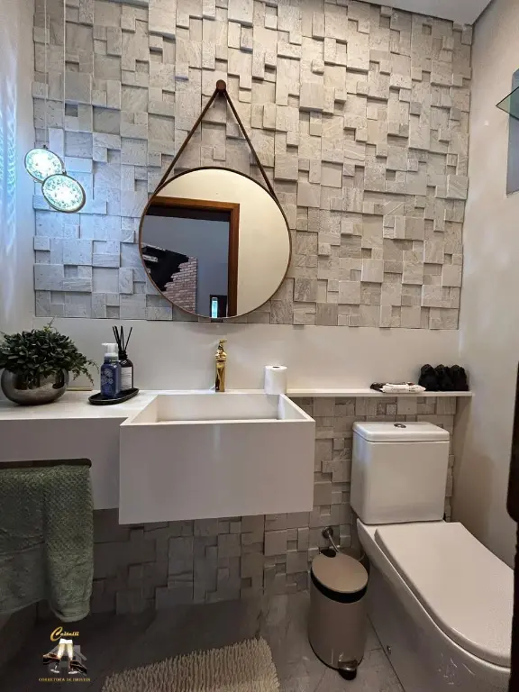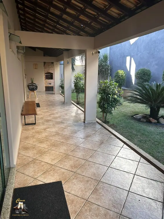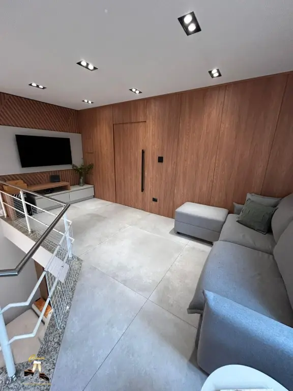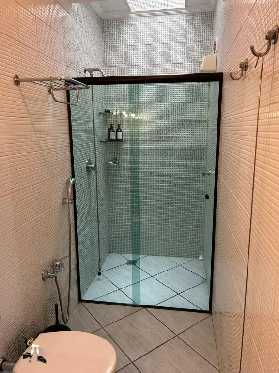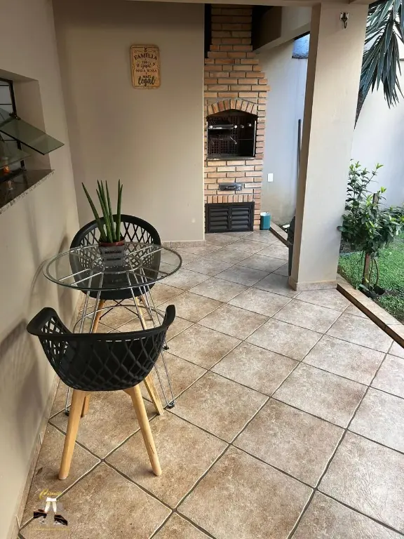 Sobrado alto padra~o, 3 dormito´rios, sendo 1 sui´te master com ar condicionado e banheira de hidromassagem, 3 salas amplas, 4 banheiros, 4 vagas de garagem com escrito´rio, banheiro e depo´sito, churrasqueira e banheiro externo de apoio, lavanderia coberta e quintal nos fundos, so´ta~o funcional e jardim.