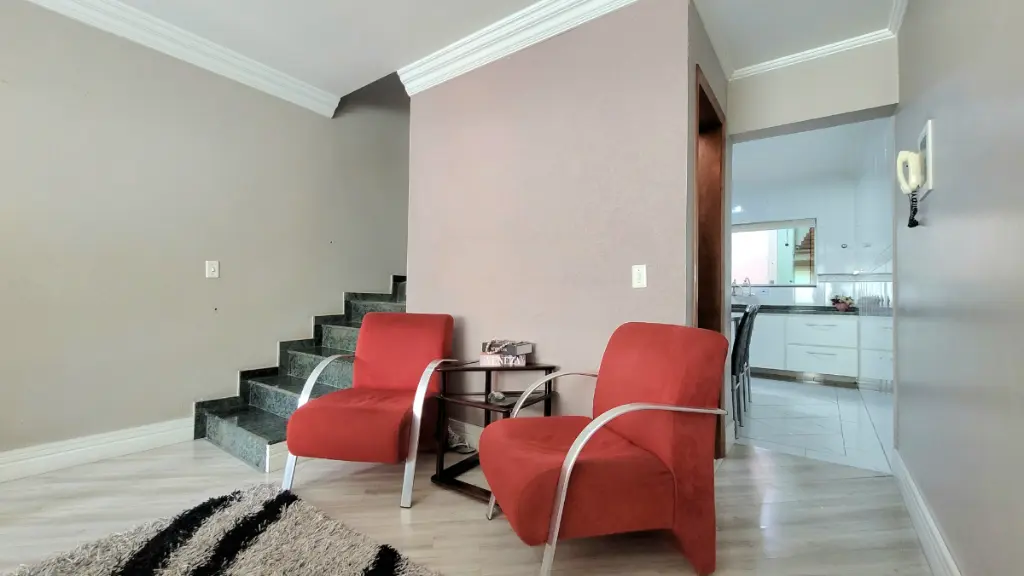 A cozinha planejada alia funcionalidade e organização. Os dormitórios e a sala possuem piso laminado, proporcionando aconchego, e a escada de acesso aos quartos conta com acabamento em granito, agregando sofisticação.