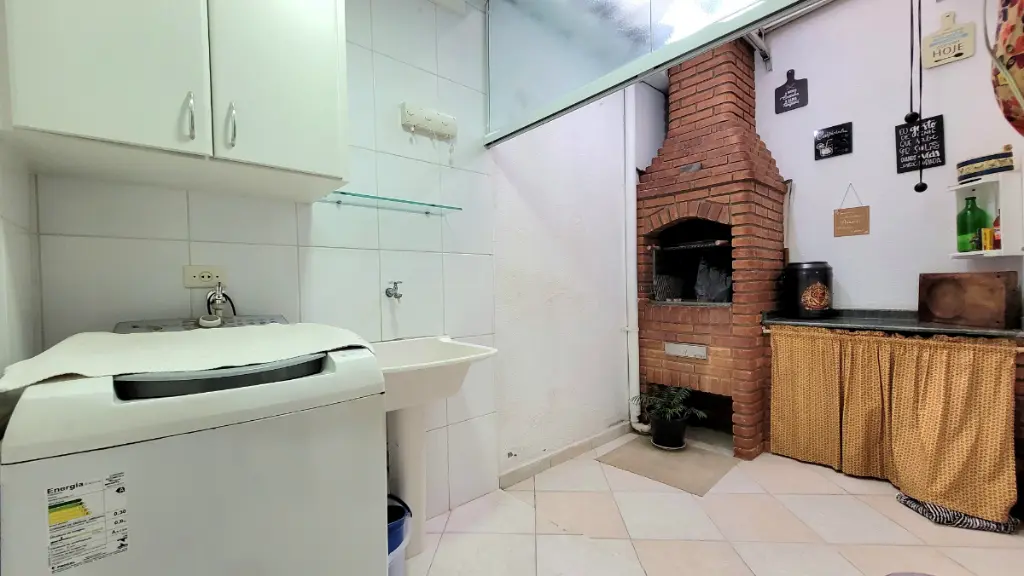 Na área externa, a lavanderia com teto retrátil e churrasqueira cria um espaço versátil para lazer em qualquer clima.